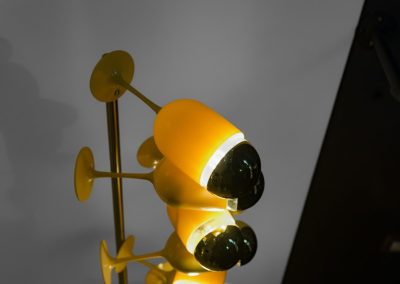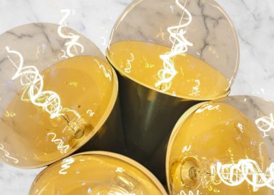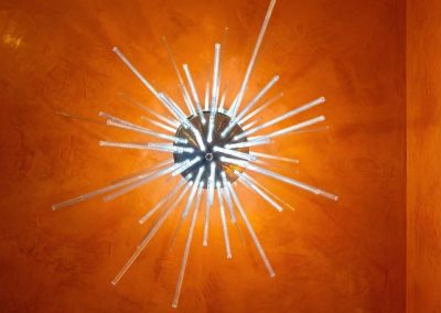 The internal light illuminates the flutes generating a pleasant prismatic effect that reflects the colors on the wall. This modern work gives a strong personality to the space. Inspired by a sense of sociability and sharing, the presence of the glasses immerses you in a lively atmosphere and elegant.