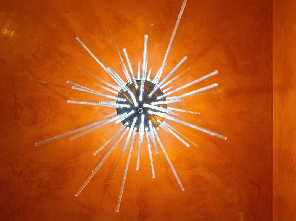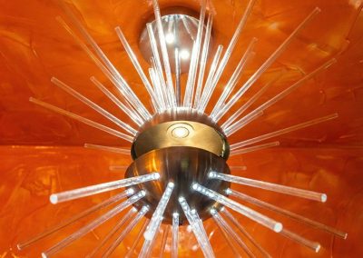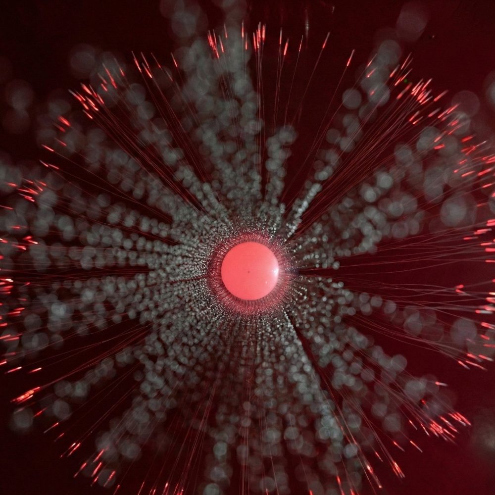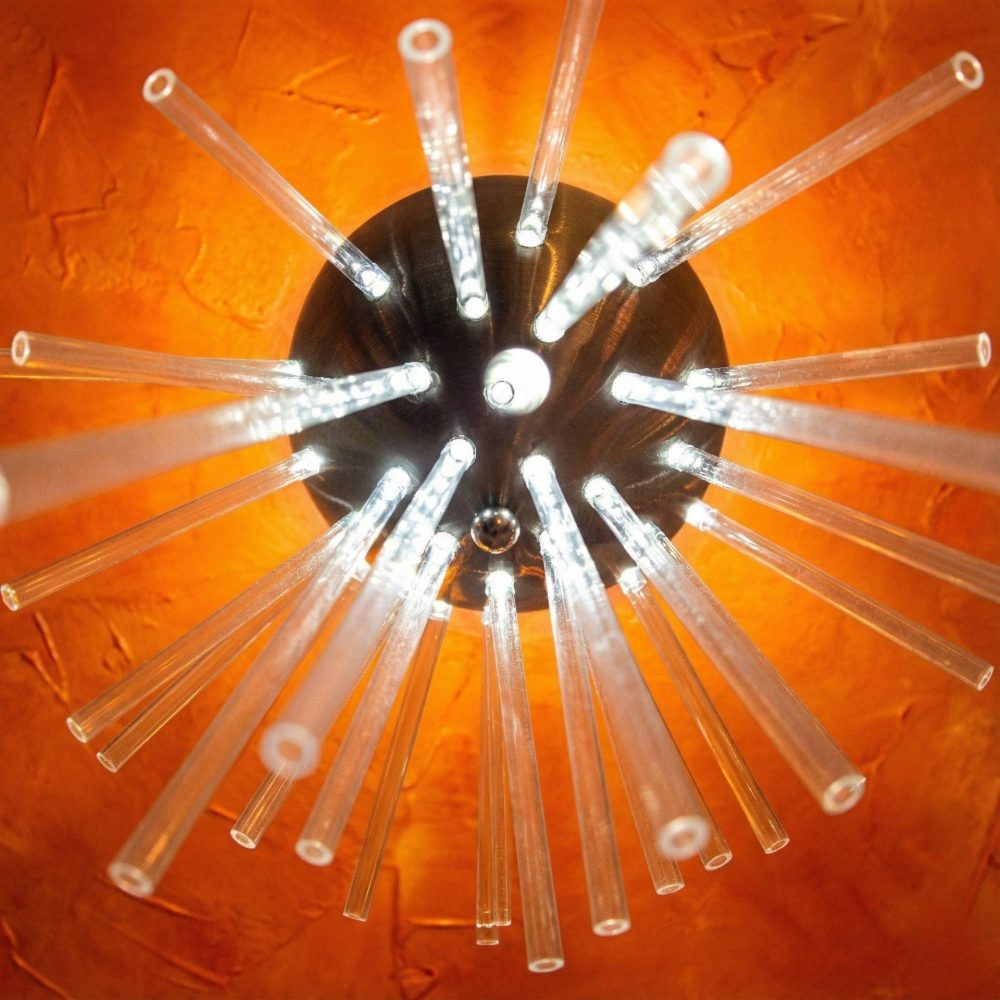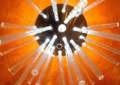 From the surface of each hemisphere emerge 43 plexiglass tubes of varying lengths, like solidified rays of light. Inside them, small 1W LED spheres backlight the structure, creating a vibrant, suspended aura — a controlled explosion of luminous energy.