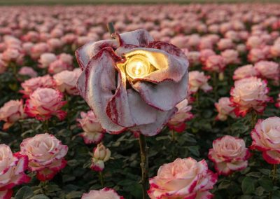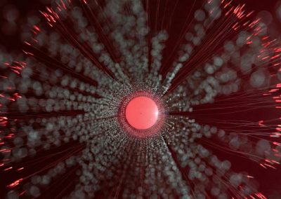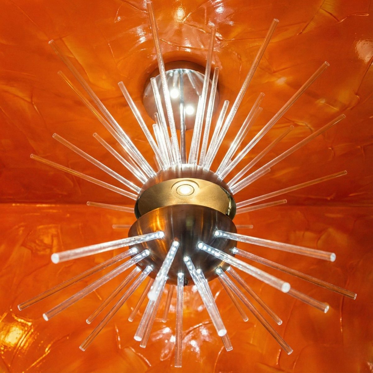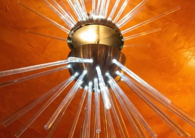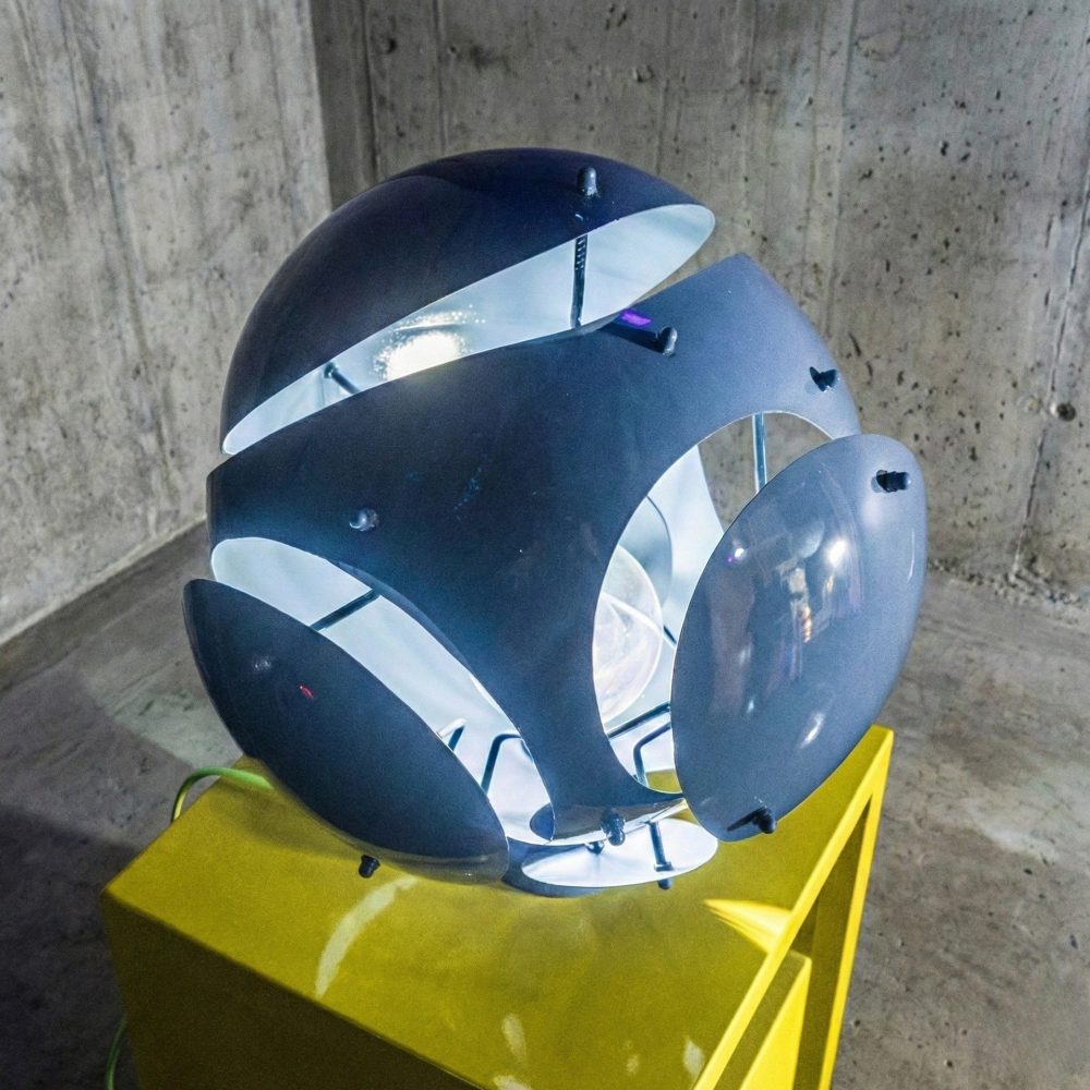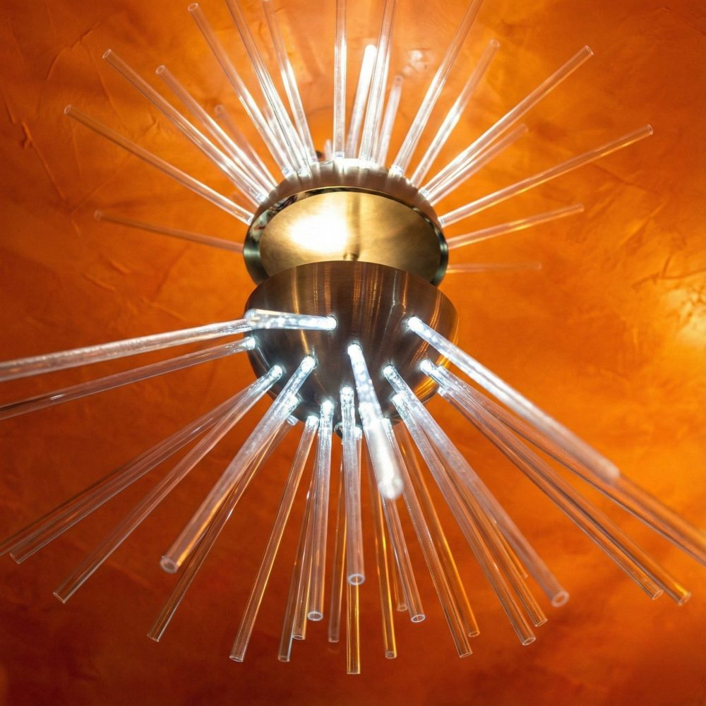 From the surface of each hemisphere emerge 43 plexiglass tubes of varying lengths, like solidified rays of light. Inside them, small 1W LED spheres backlight the structure, creating a vibrant, suspended aura — a controlled explosion of luminous energy.