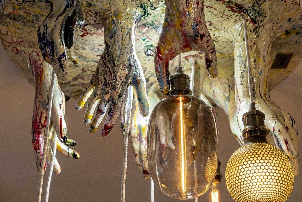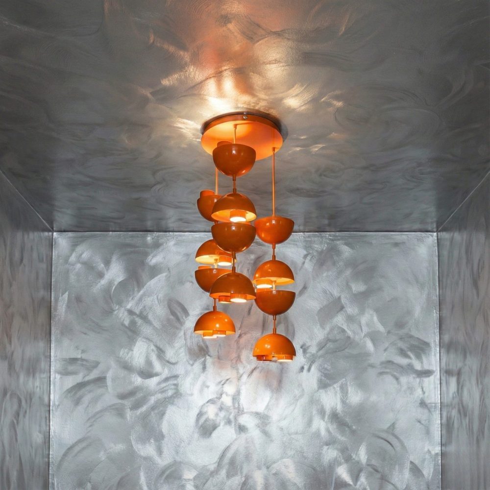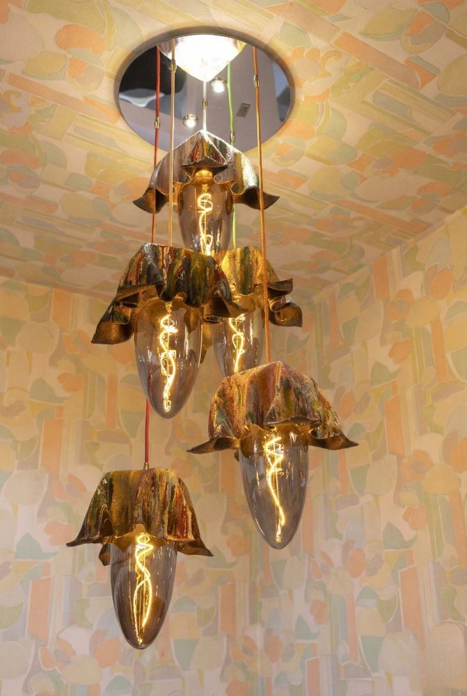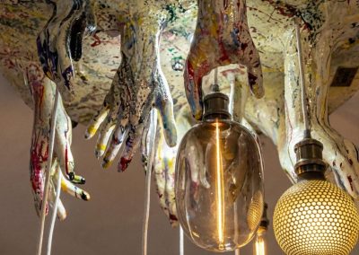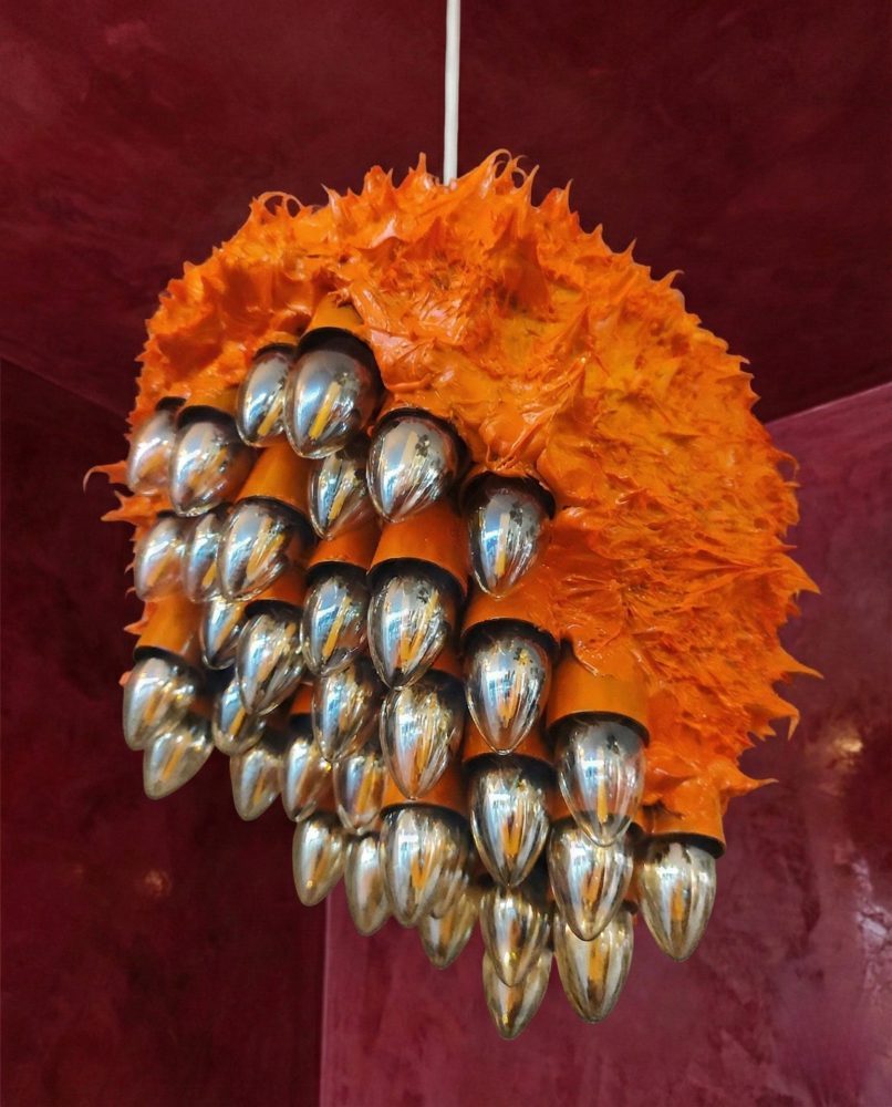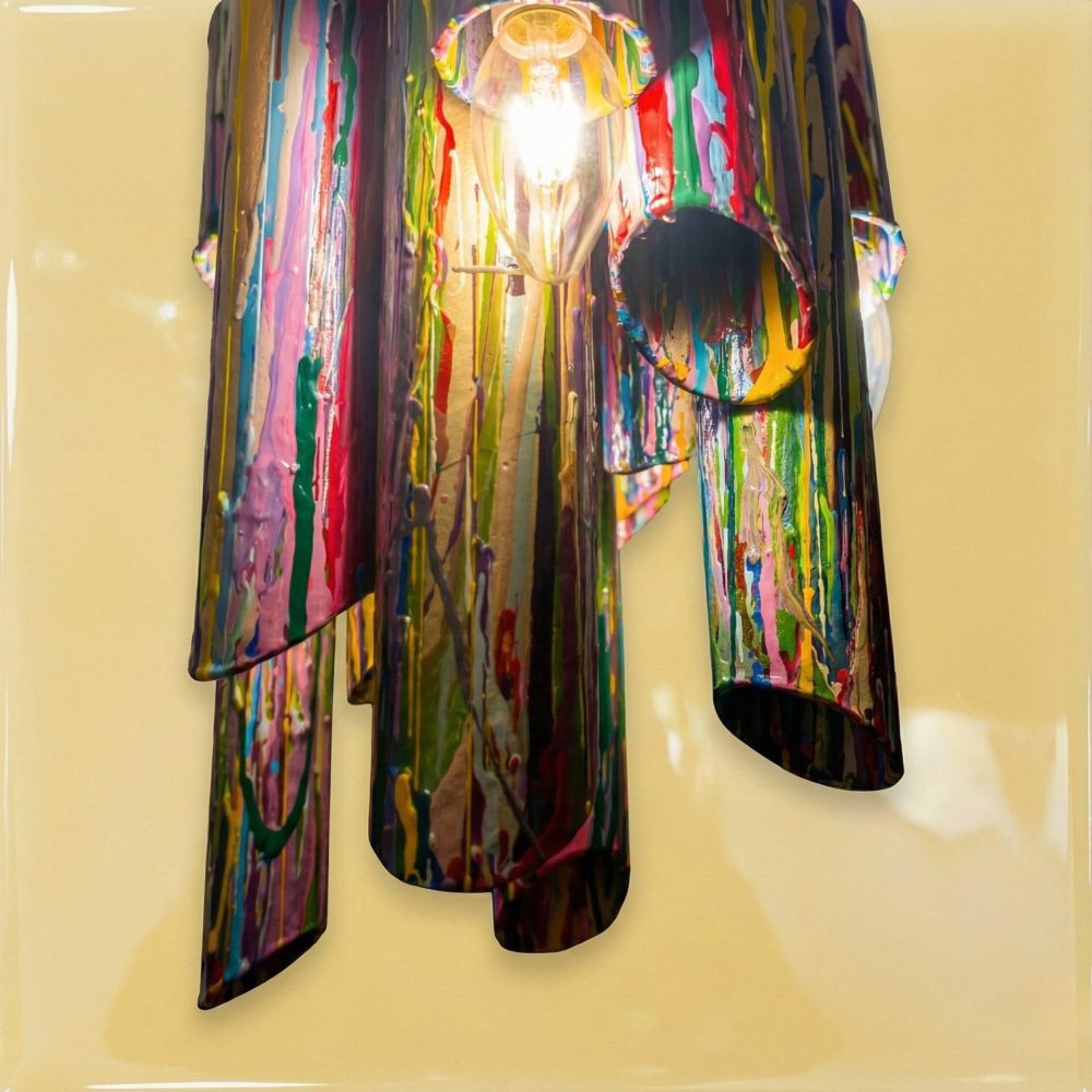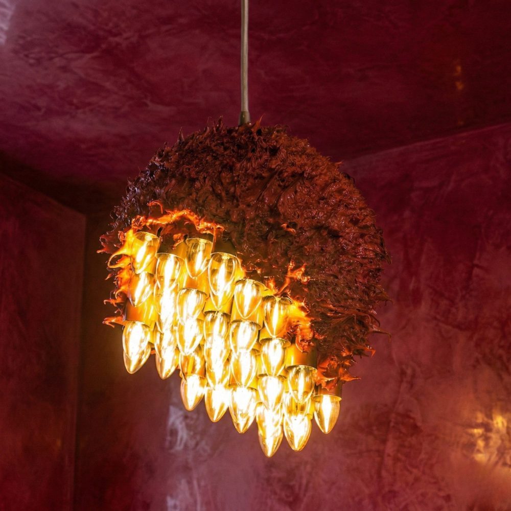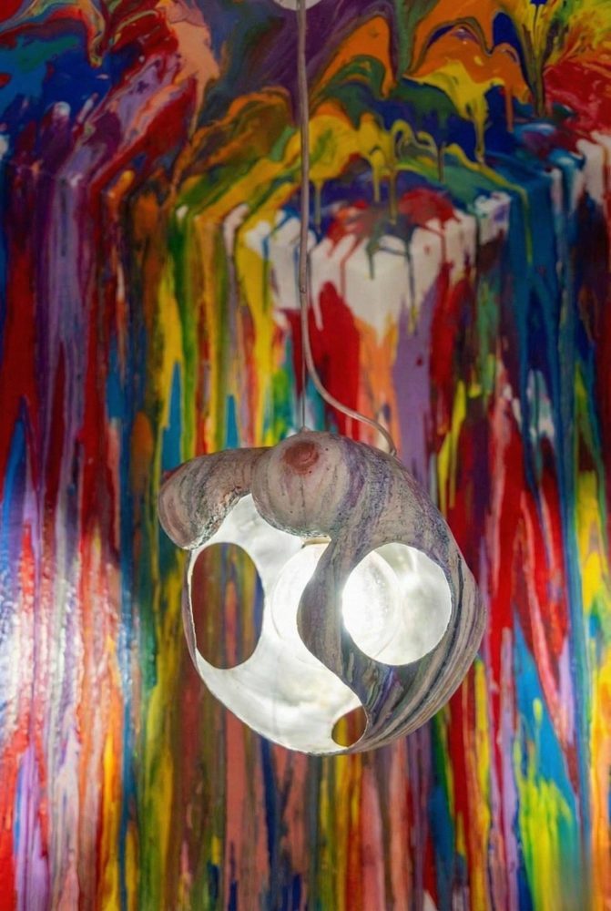 Attic wall chandelier with a contemporary style. Gives the room a unique or modern touch of style. LIQUEFACTION is a colourful, eccentric and sophisticated work of art. The spheres are covered with loose plastic material that drips like lava, forming irregular fringes of loose matter.