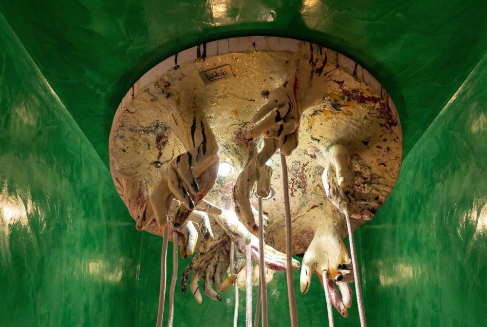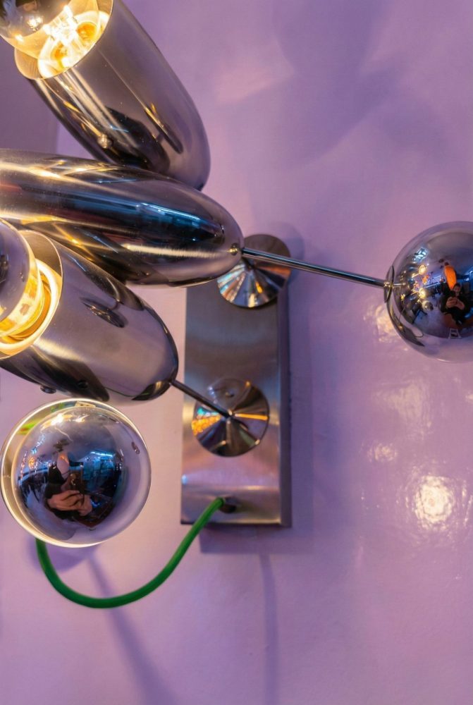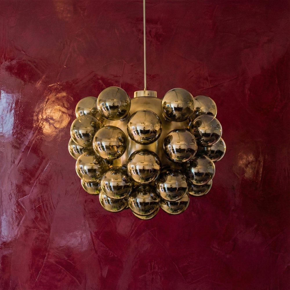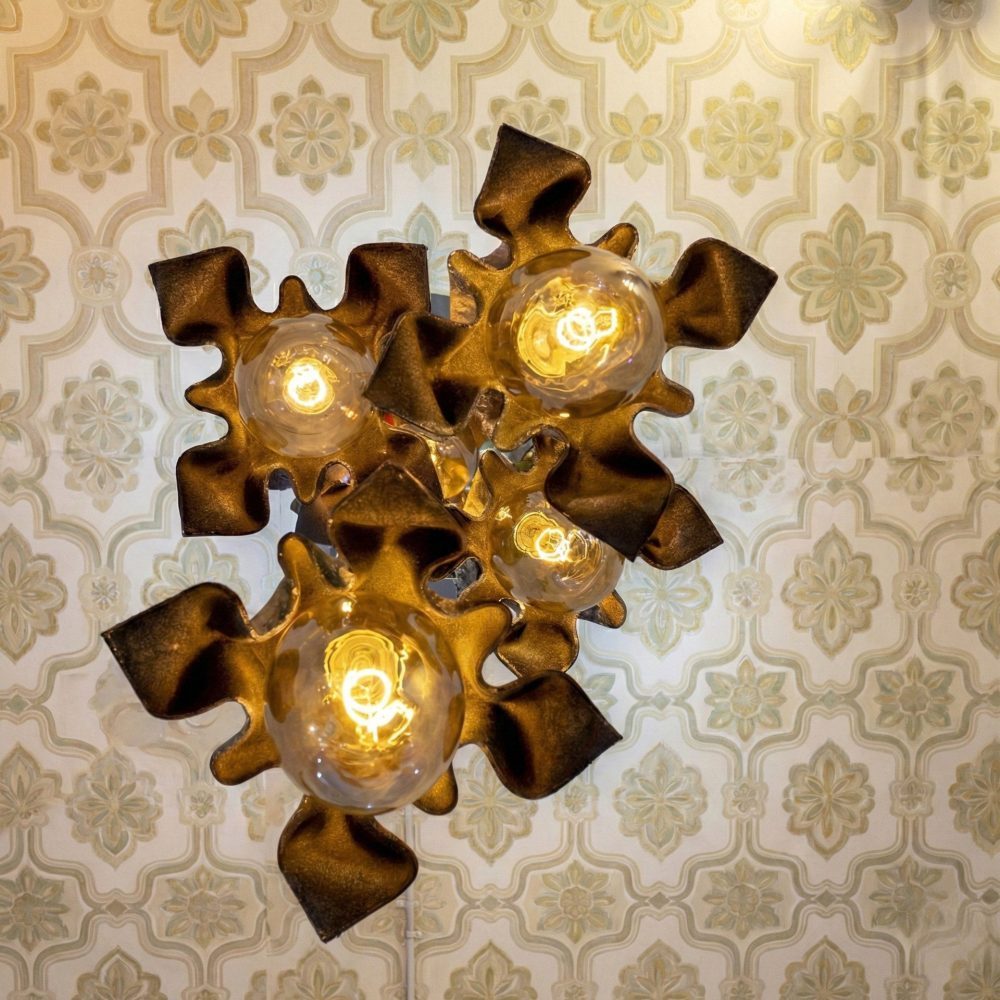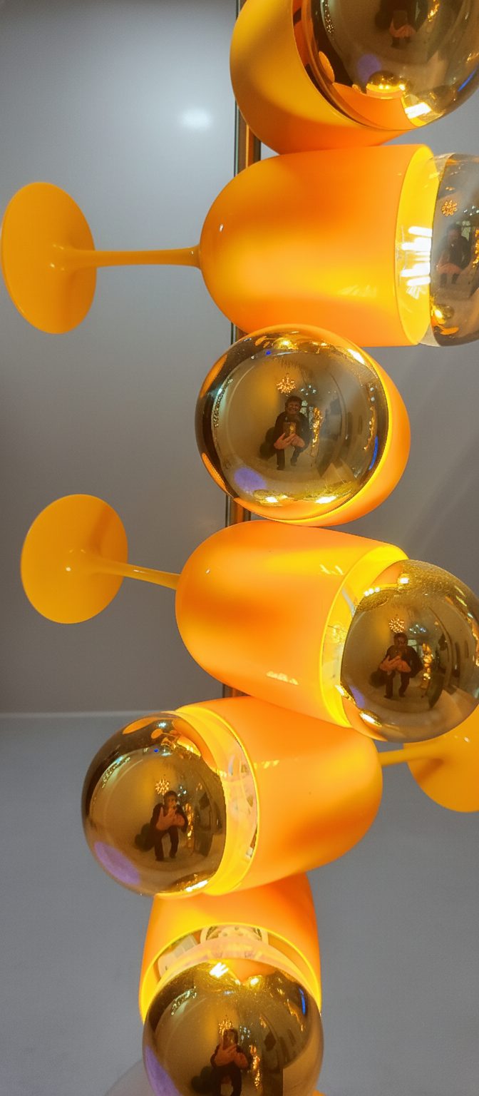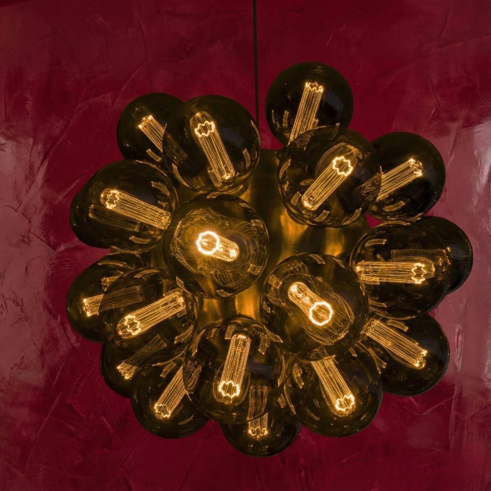 Attic wall chandelier with a contemporary style. Gives the room a unique or modern touch of style. LIQUEFACTION is a colourful, eccentric and sophisticated work of art. The spheres are covered with loose plastic material that drips like lava, forming irregular fringes of loose matter.