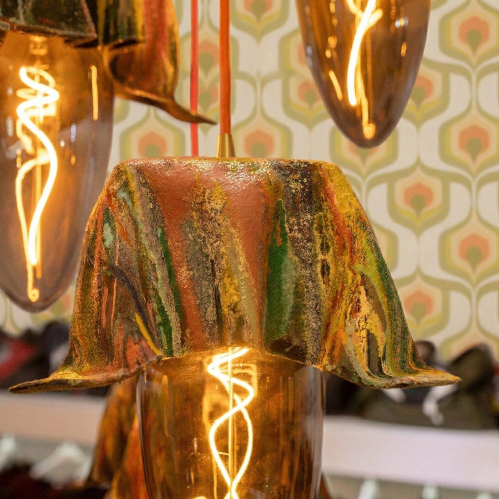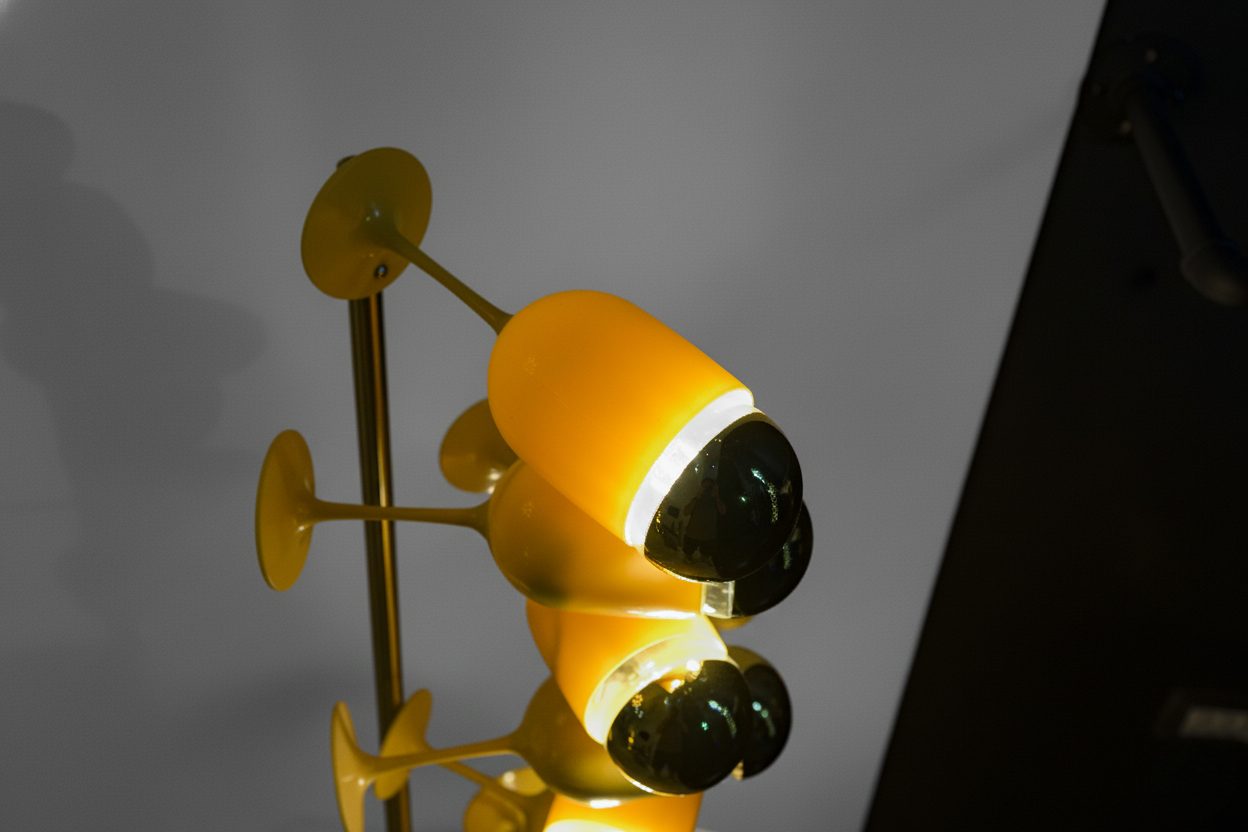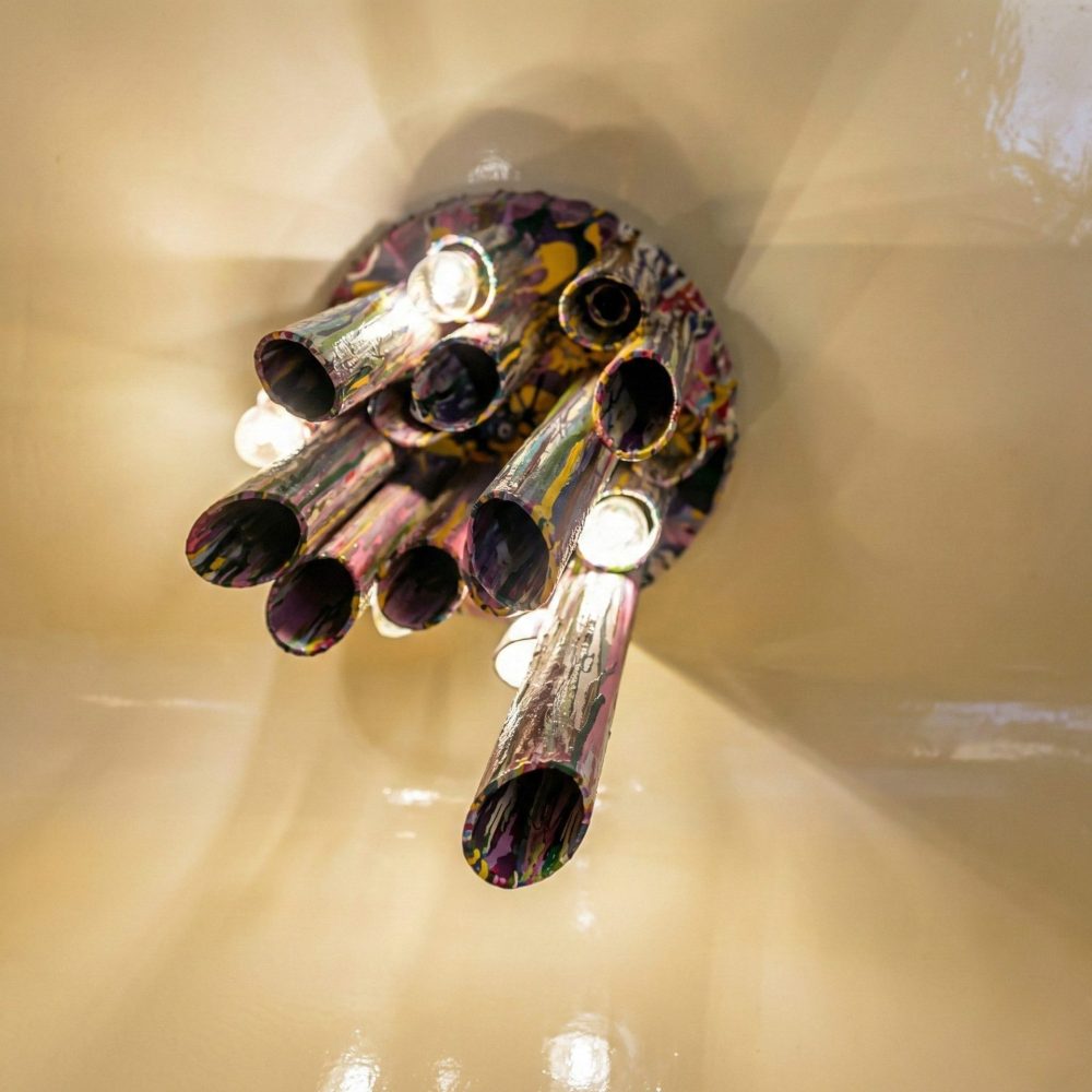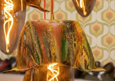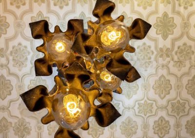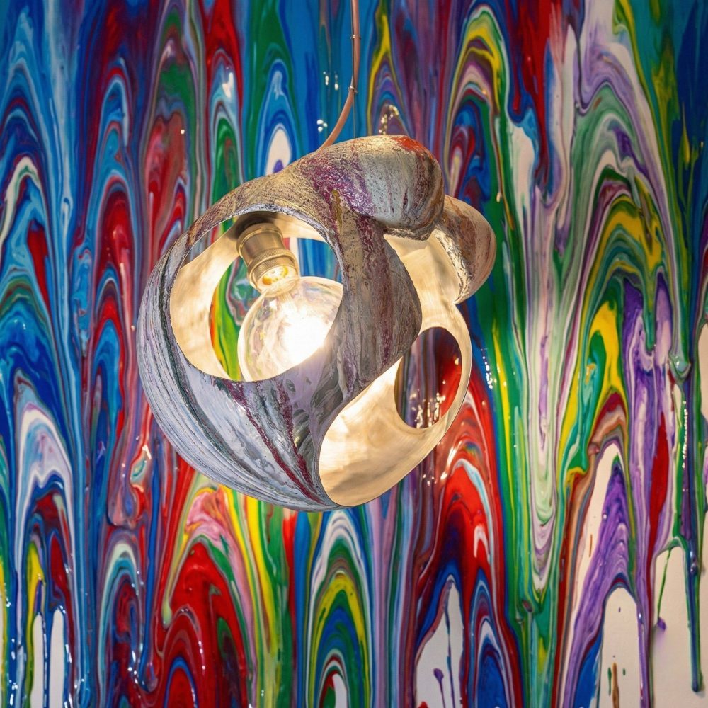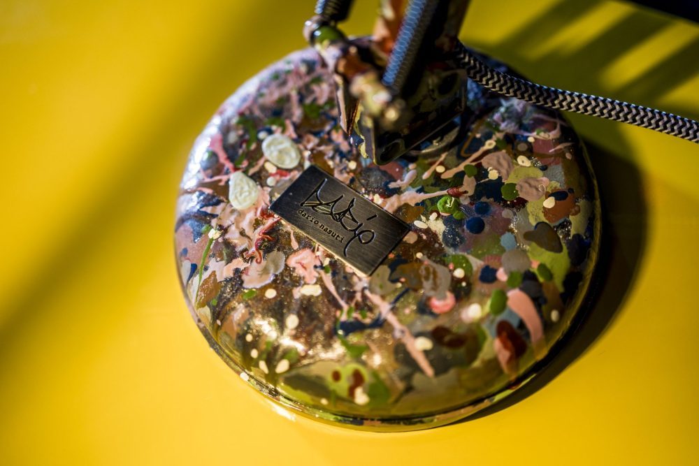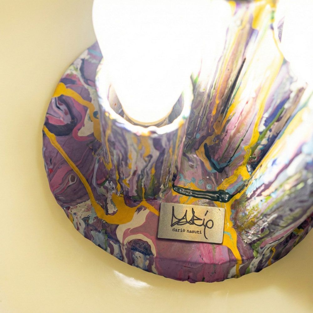 The central element of the work is the sculptural lampshade, made with four wool panels. Each panel was hand-punched with a die, then kneaded in paint and shaped into a sphere to acquire a curved, organic shape. The final treatment is a multicolored paint that simulates the brilliance and texture of glazed ceramic, obtaining an unexpected and refined visual effect.