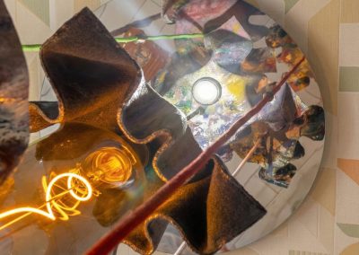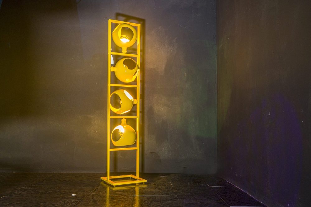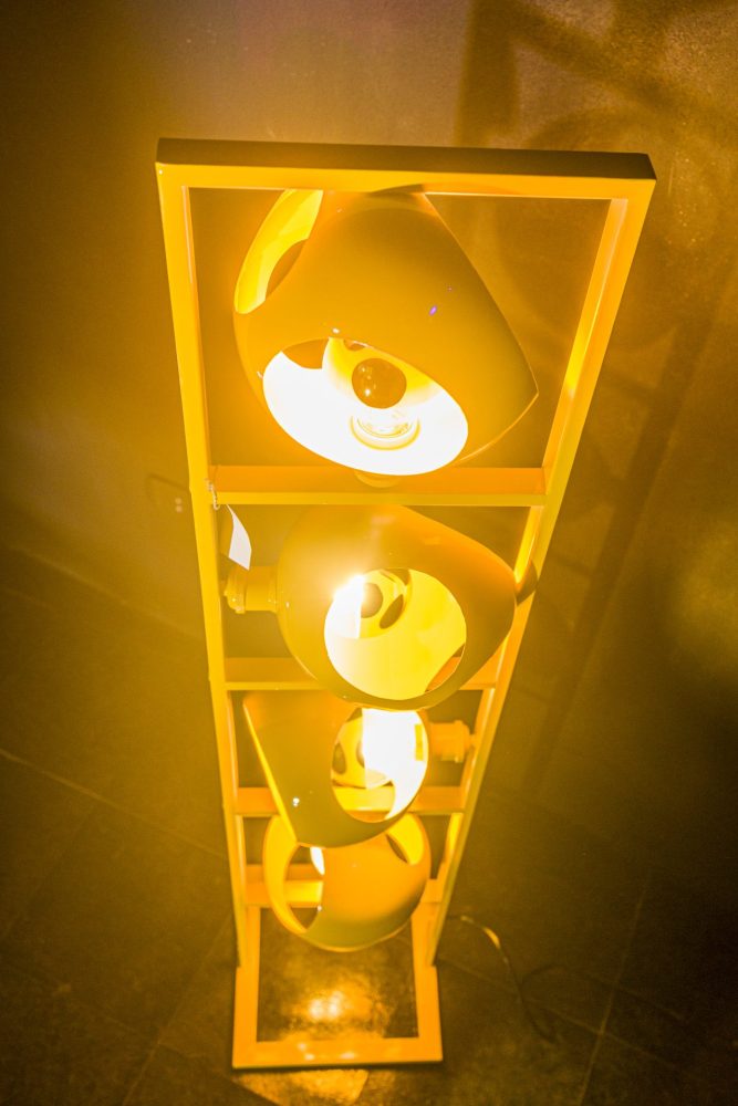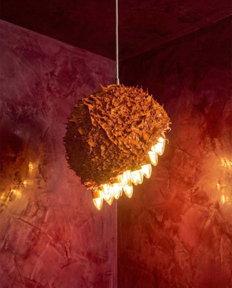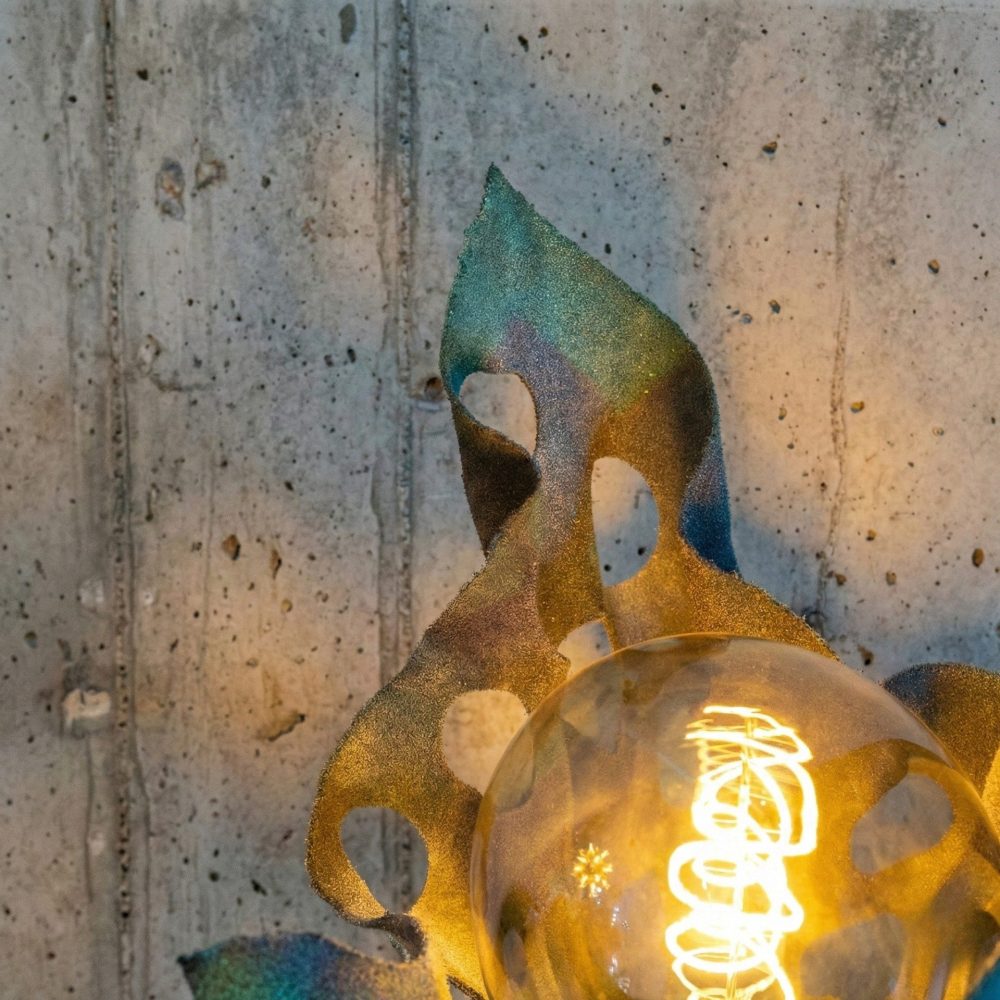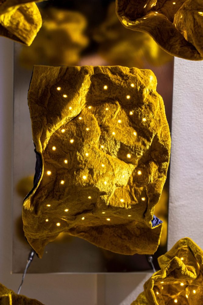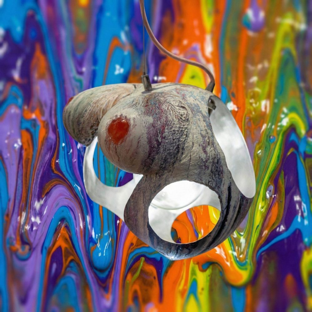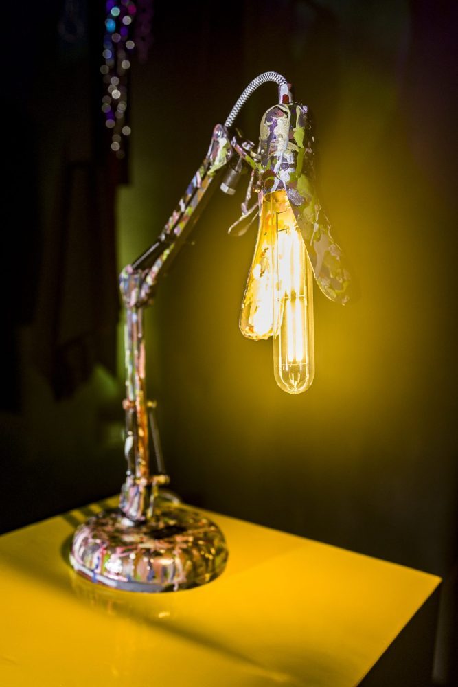 The central element of the work is the sculptural lampshade, made with four wool panels. Each panel was hand-punched with a die, then kneaded in paint and shaped into a sphere to acquire a curved, organic shape. The final treatment is a multicolored paint that simulates the brilliance and texture of glazed ceramic, obtaining an unexpected and refined visual effect.