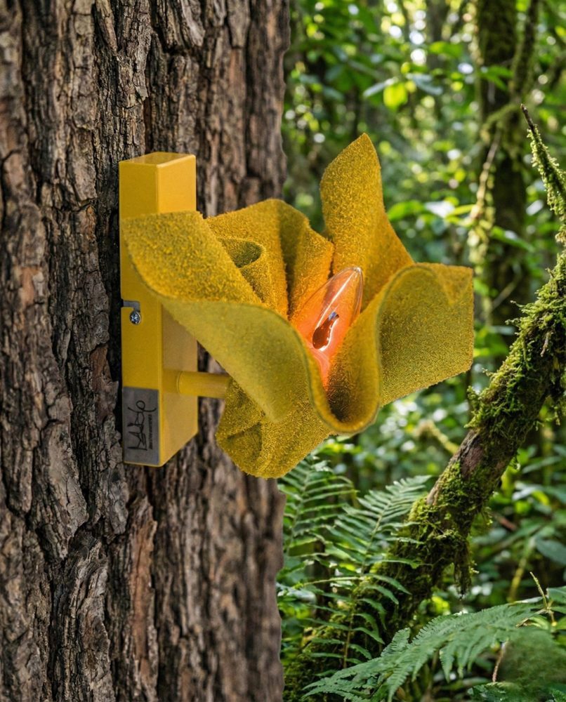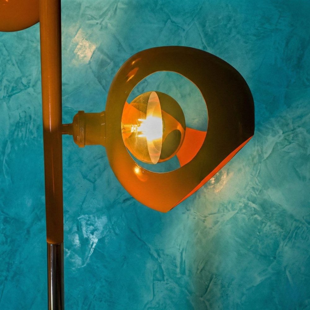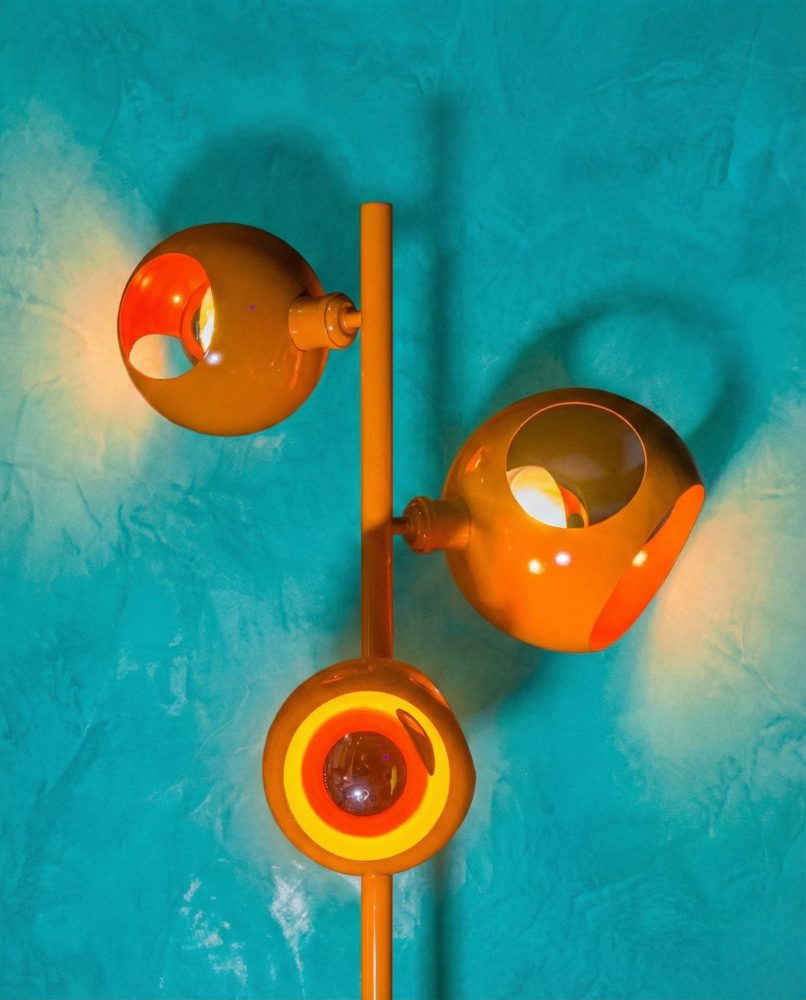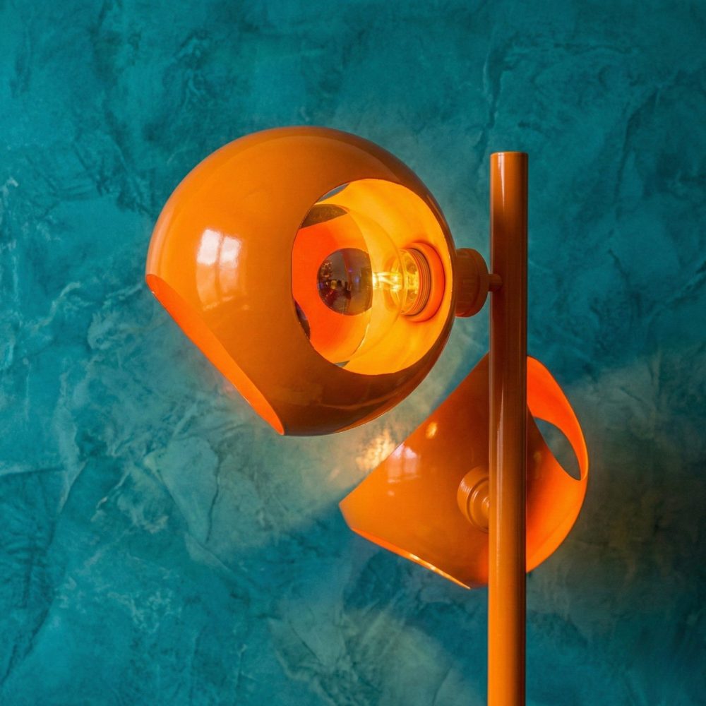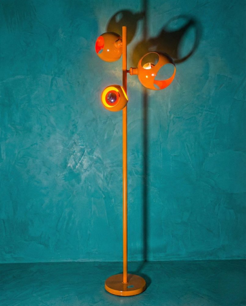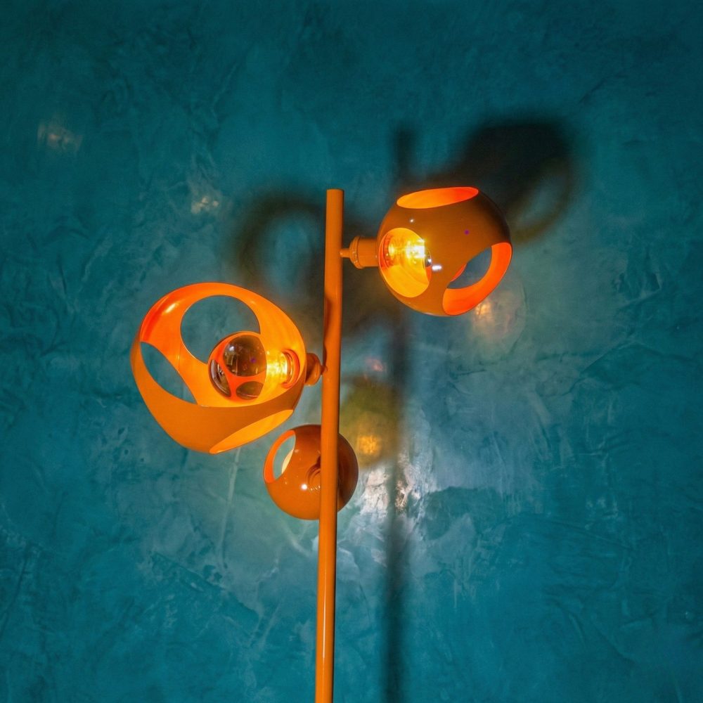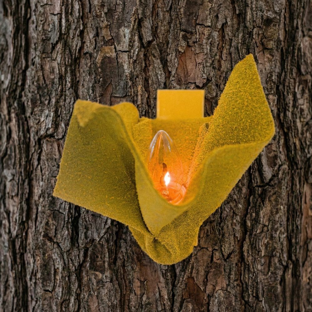 The central element of the work is the sculptural lampshade, made with four wool panels. Each panel was hand-punched with a die, then kneaded in paint and shaped into a sphere to acquire a curved, organic shape. The final treatment is a multicolored paint that simulates the brilliance and texture of glazed ceramic, obtaining an unexpected and refined visual effect.