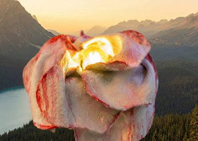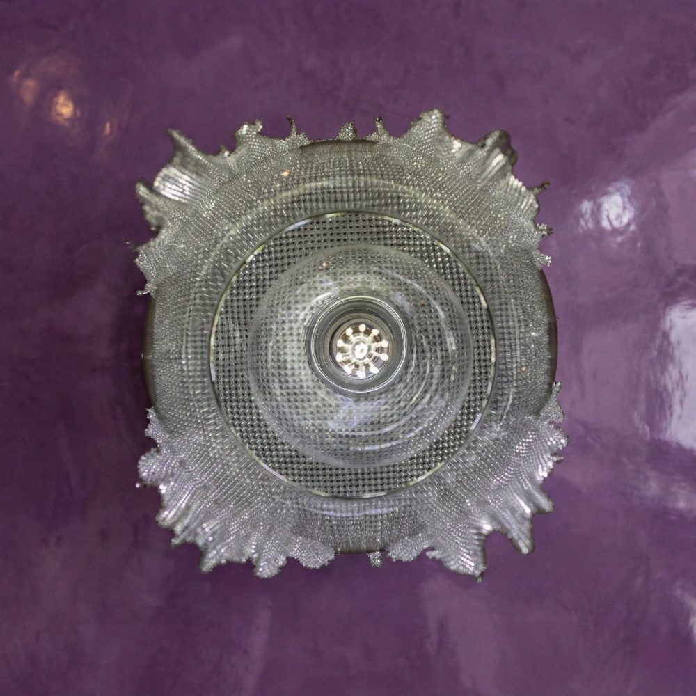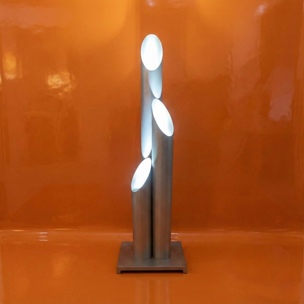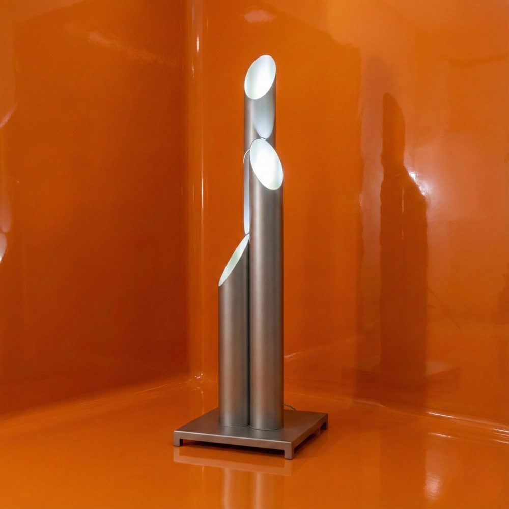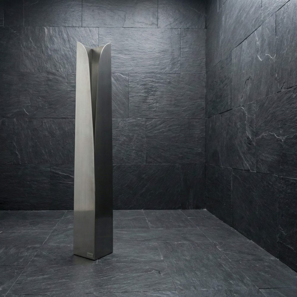 The work is inspired by the poetic image of a fountain frozen in ice on Lake Misurina, conveyed through cold materials, diffused light, and rhythmic structure.. From the metal rosette unfolds a luminous geometry formed by backlit plexiglass tubes arranged in a triangular pattern: these vertical elements capture and refract light like suspended columns of ice.