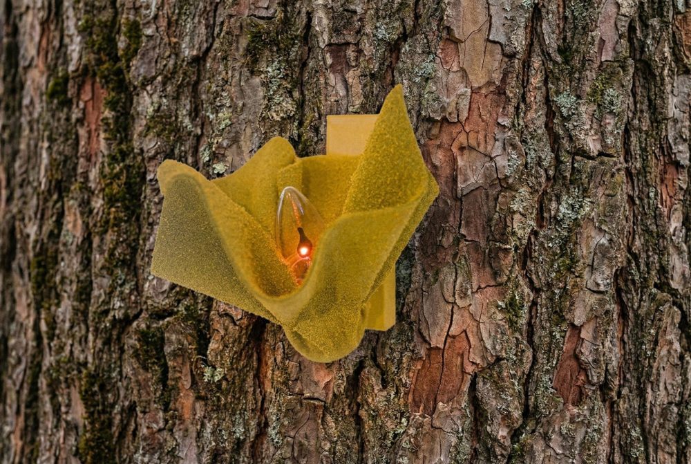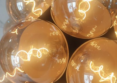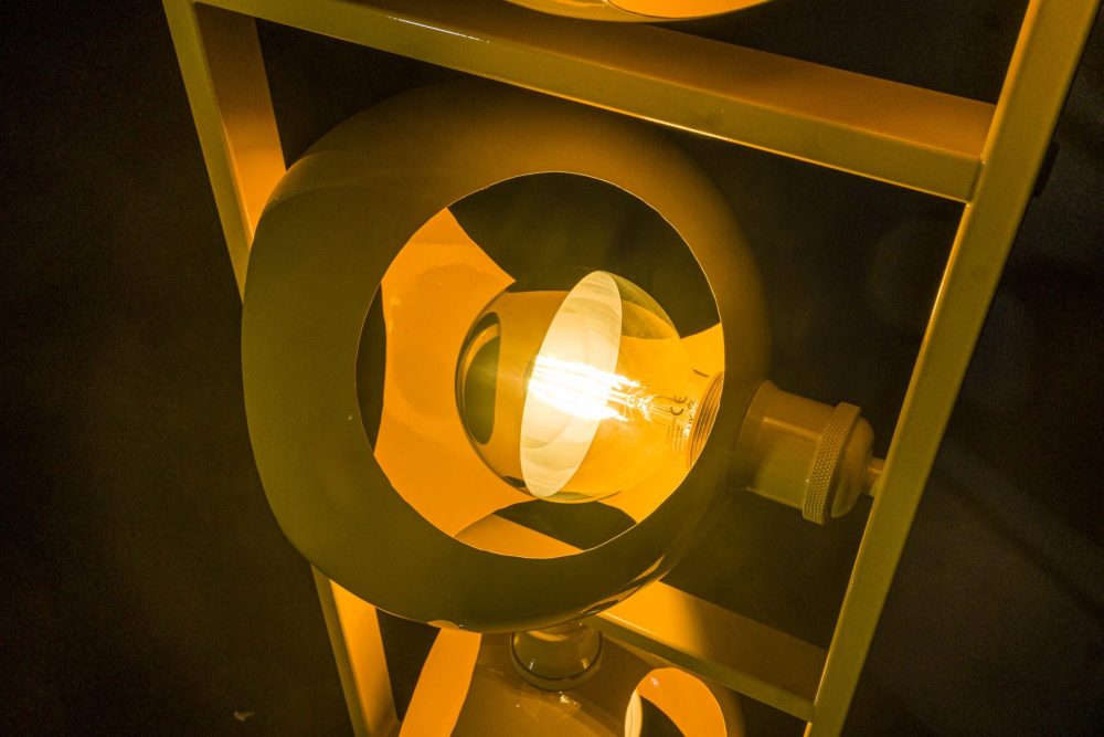 The path of the rings ends in the embrace of a large LED bulb—suspended like a glowing heart wrapped in a protective mesh.