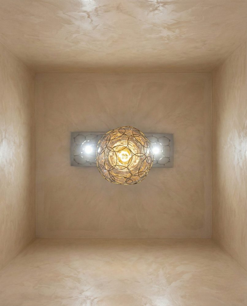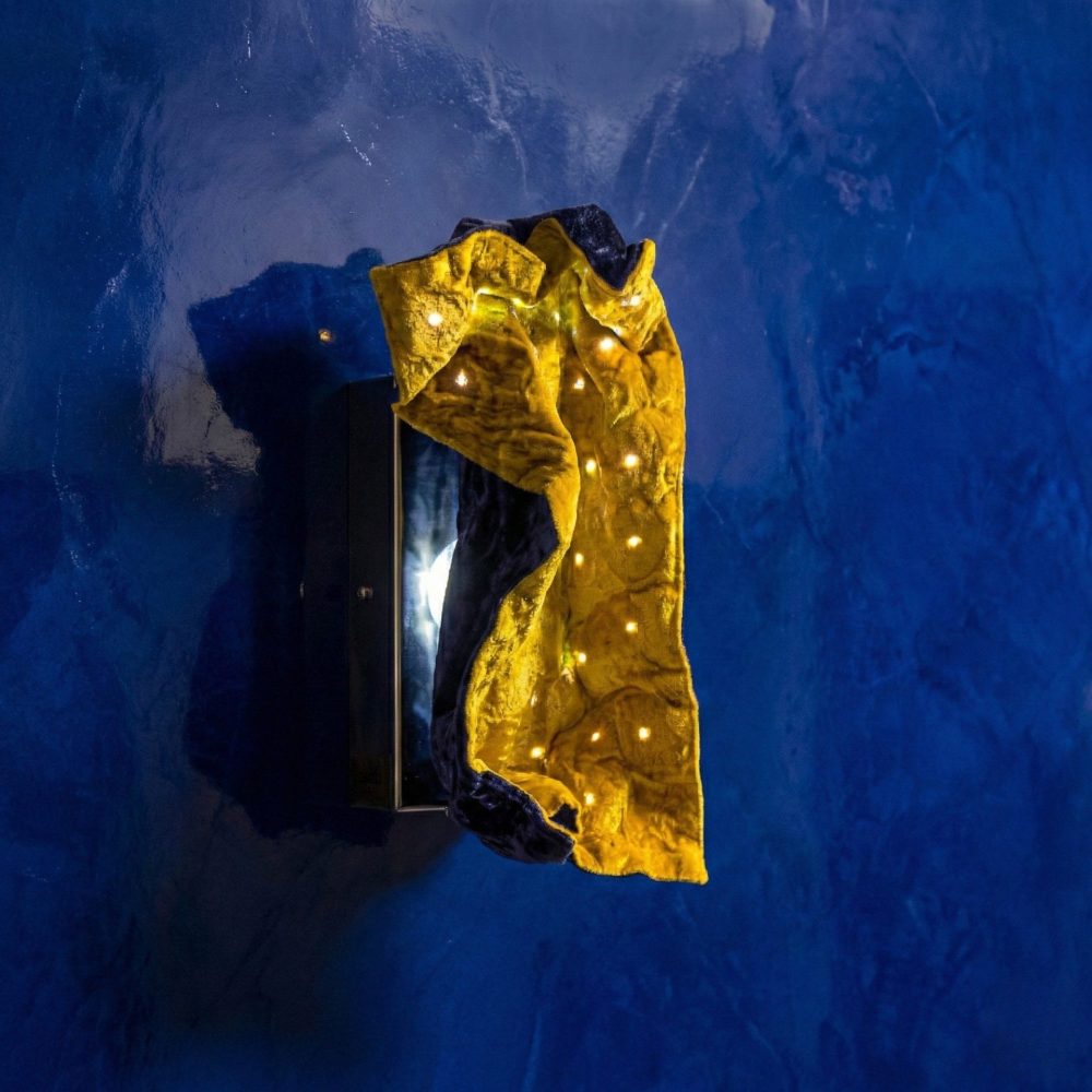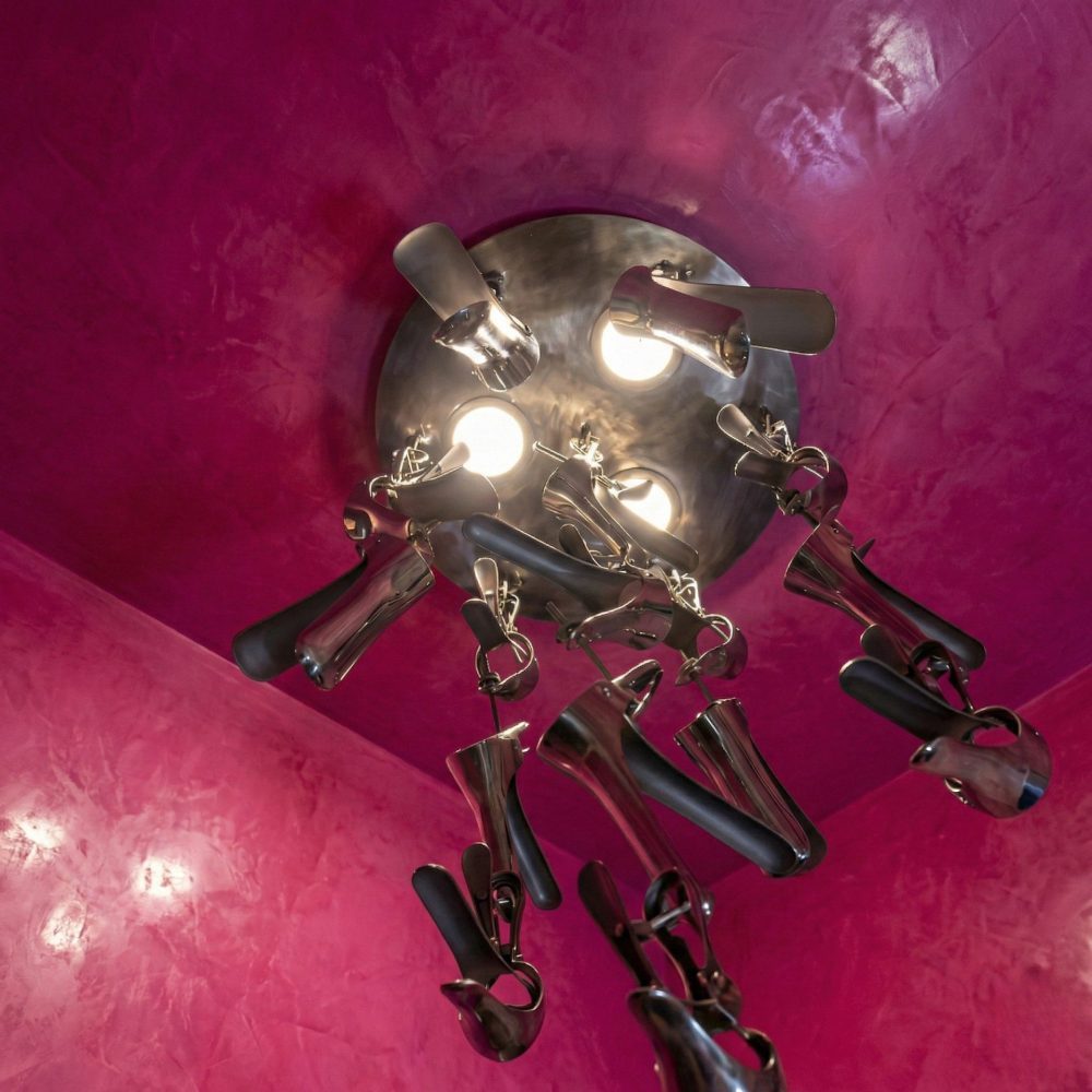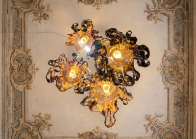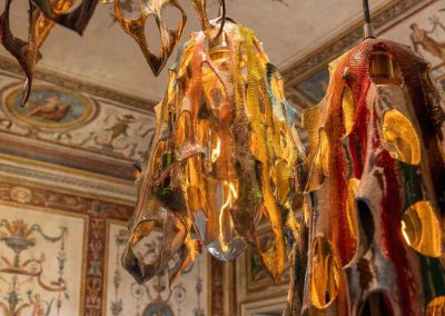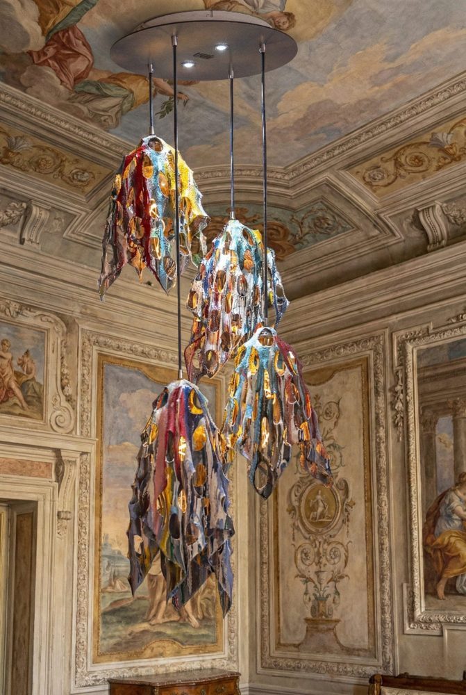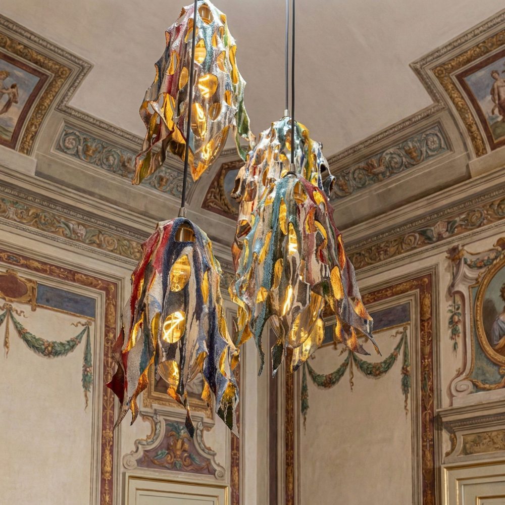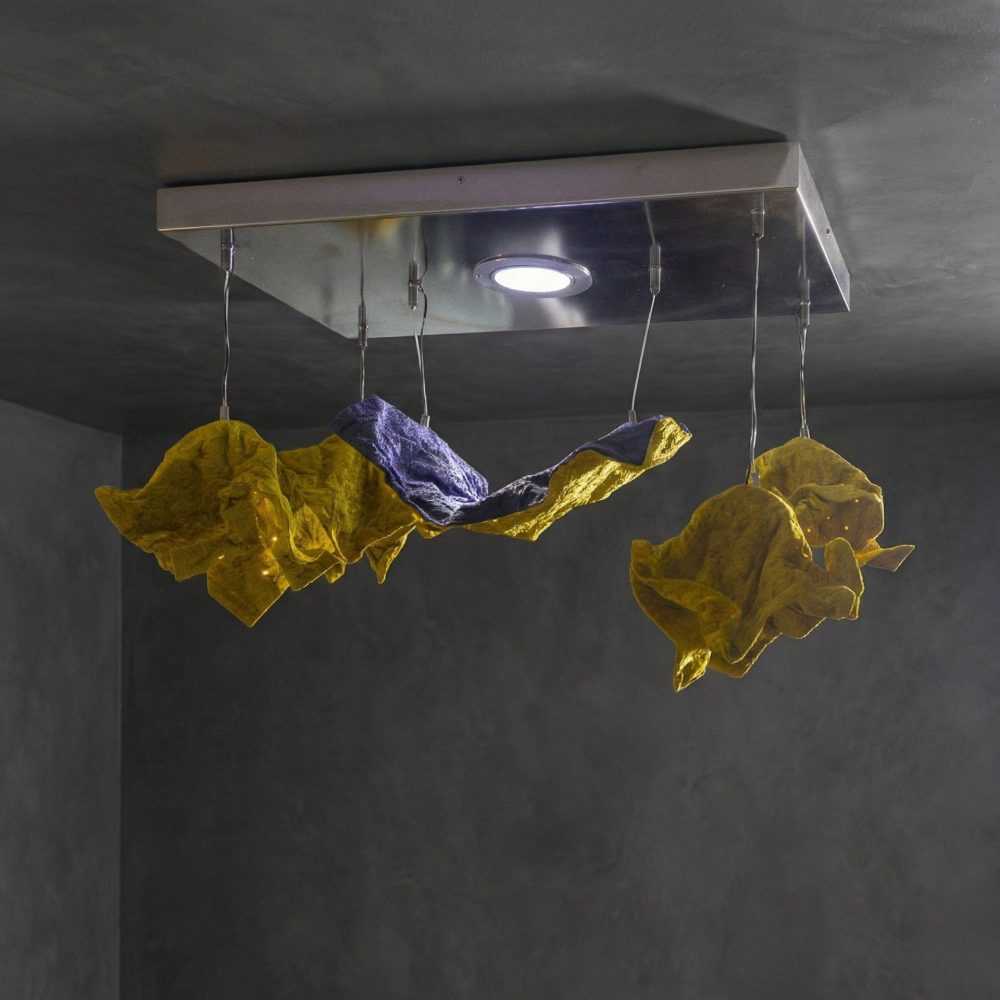 Ceramico is a suspended light sculpture that combines textile experimentation, organic design and painting techniques to create an object suspended between art and light, designed to amplify the atmosphere and shadows generated by the lampshade. The structure has four staggered light points, supported by a satin steel rosette with two recessed LED spotlights.