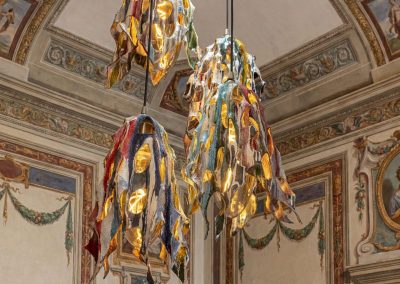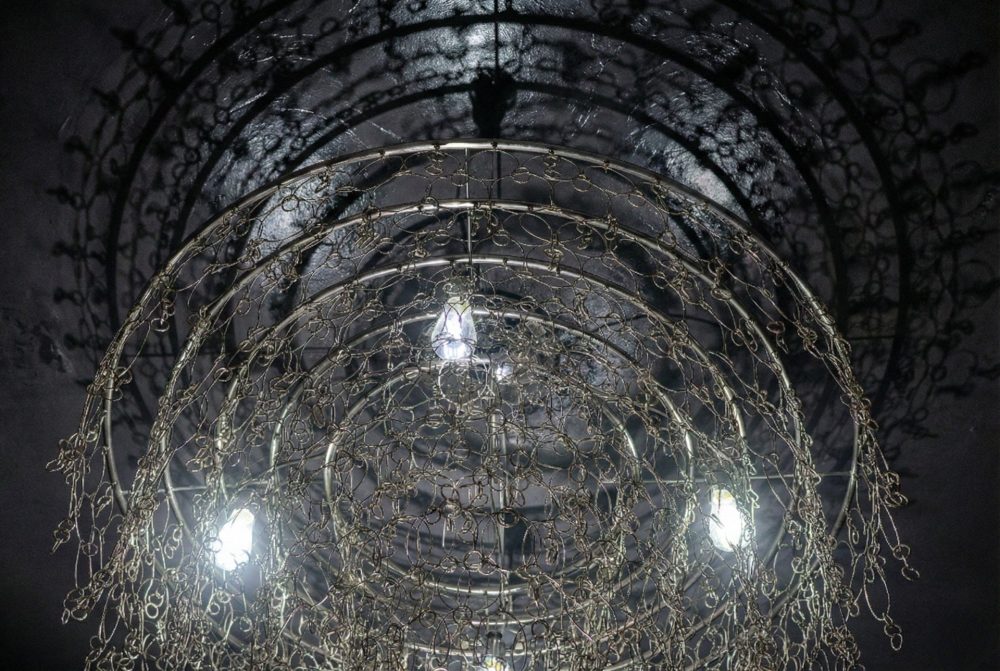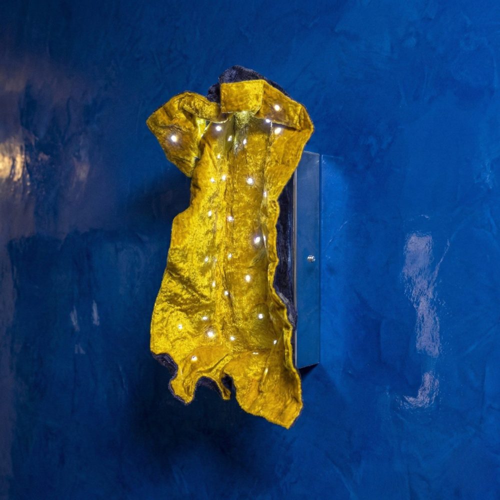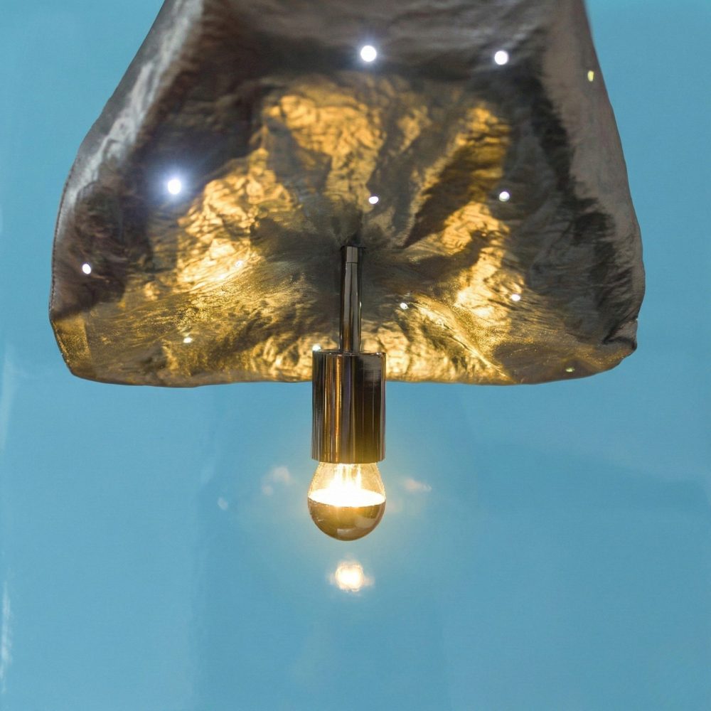 CRISALIDE is a suspended light sculpture that blends textile gesture and metallic matter to evoke a transformation in progress.