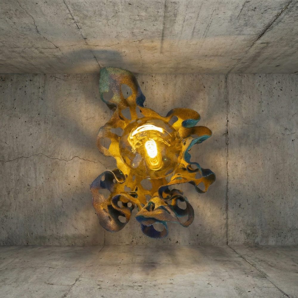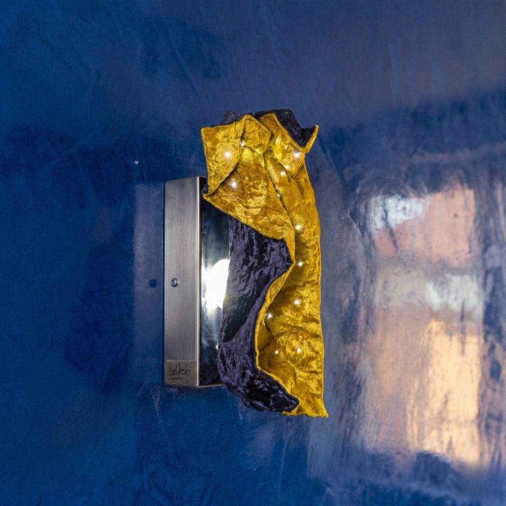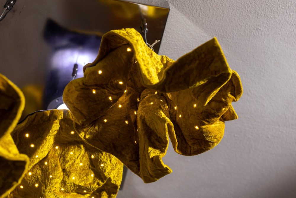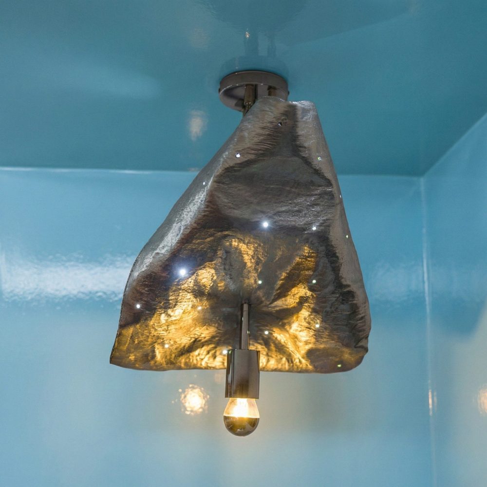CRISALIDE is a suspended light sculpture that blends textile gesture and metallic matter to evoke a transformation in progress.