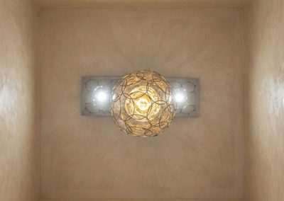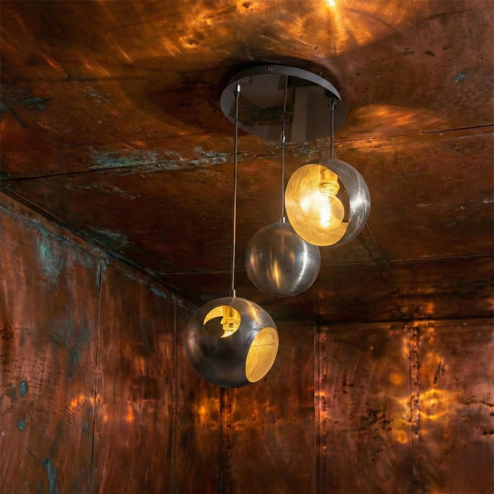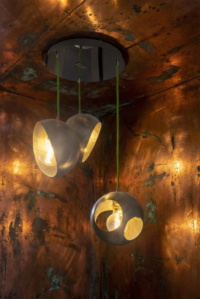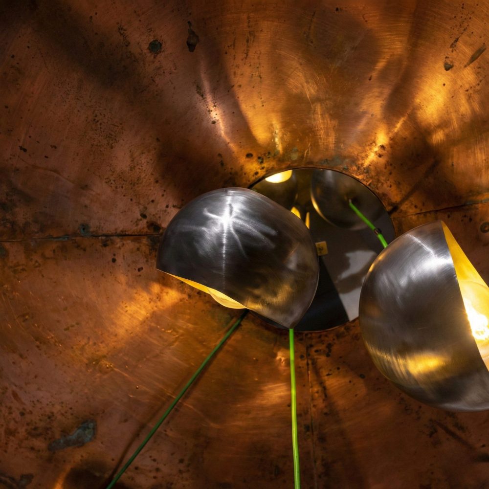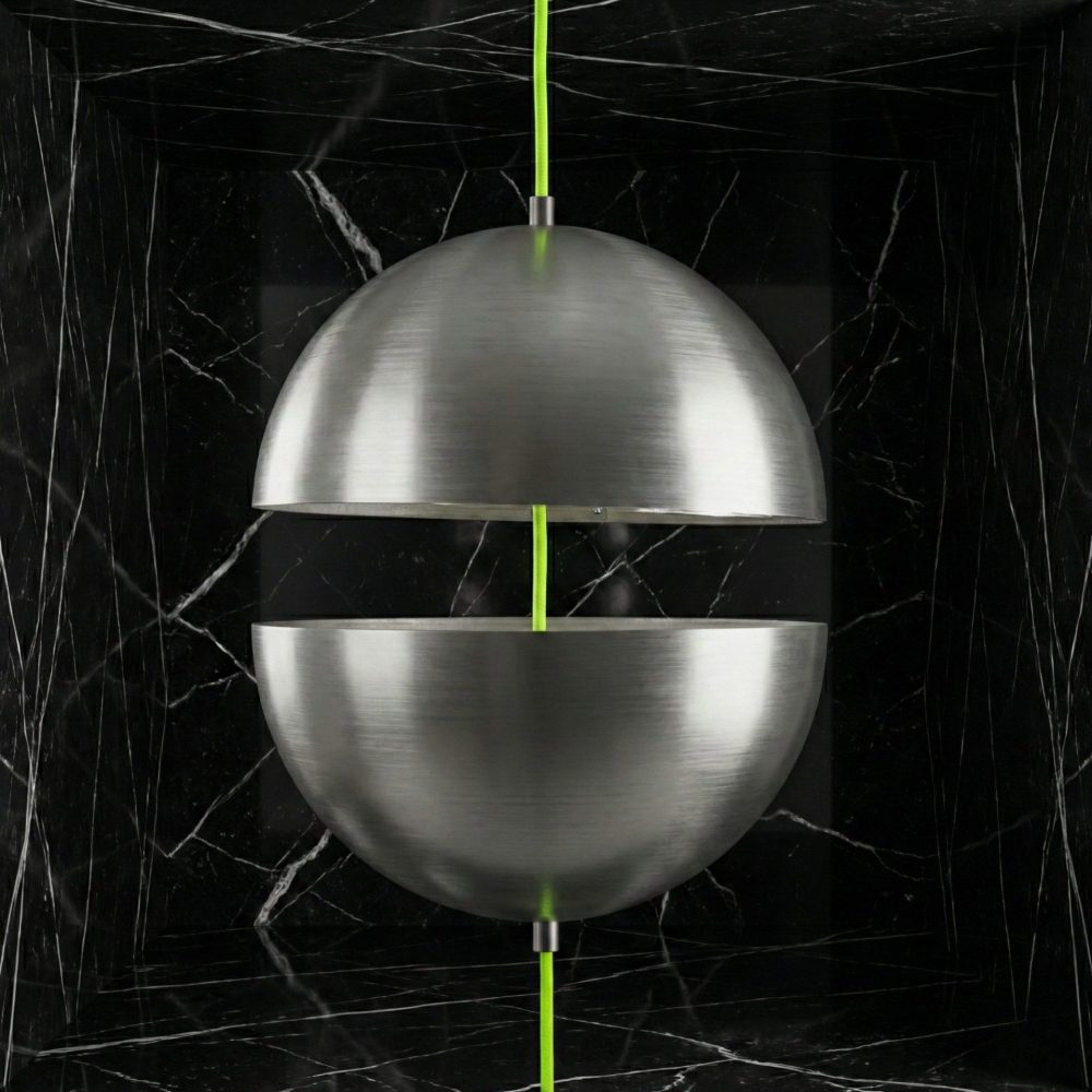 Suspended light sculpture composed of two carefully overlapping steel hemispheres, leaving a central void from which a warm, intense light radiates, generated by two recessed 3W spotlights.