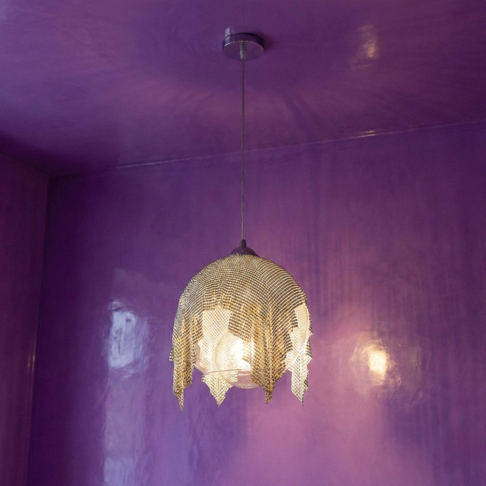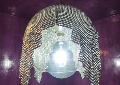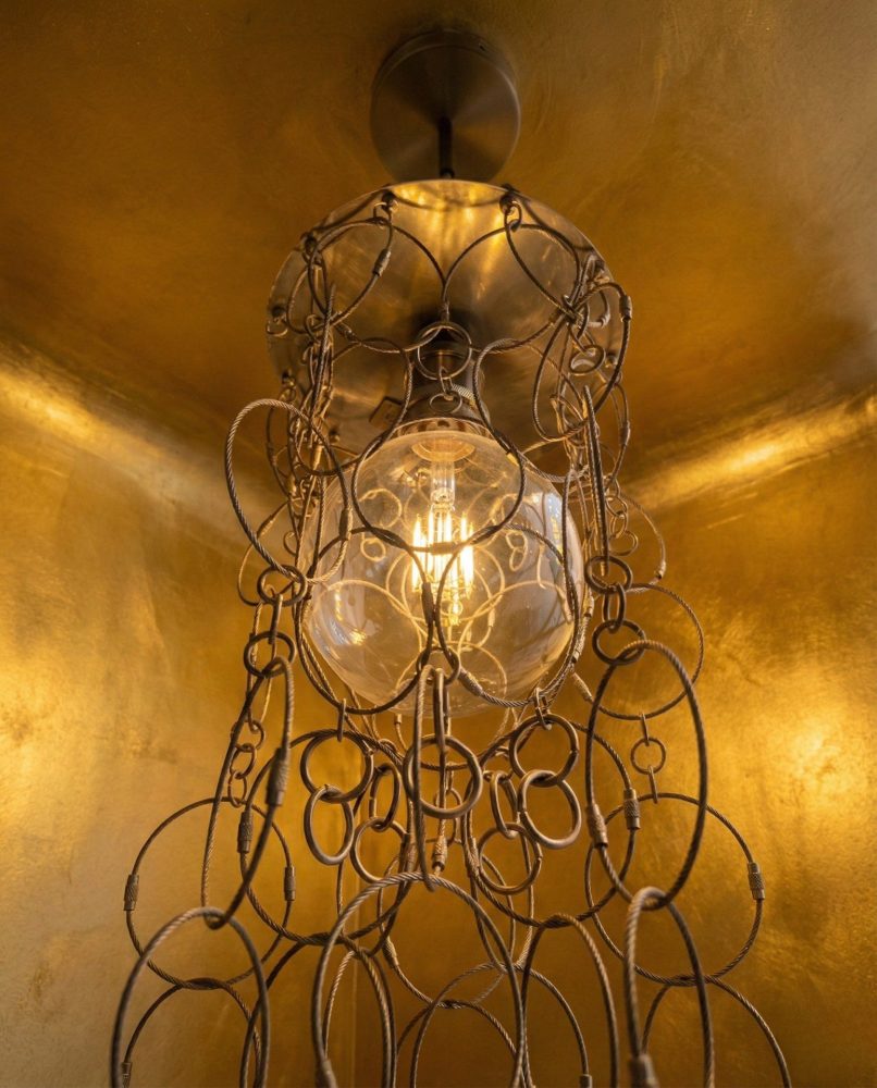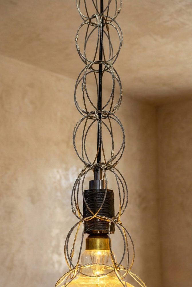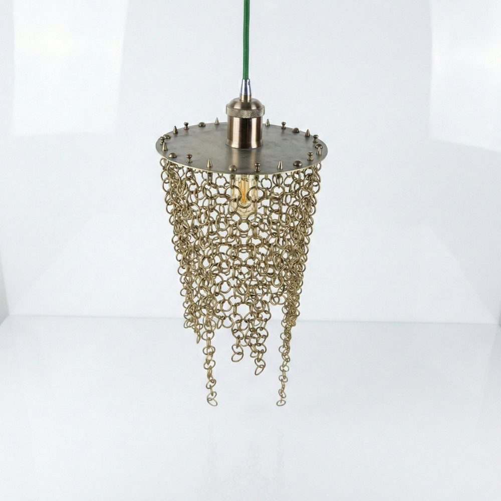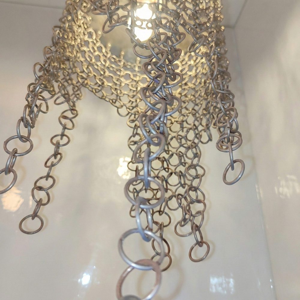 ELMO is a pendant lamp that combines vintage and modern art design. A chich work of contemporary charm and 60s references. Composed of steel rings, the artist was inspired by the armour of warriors, creating a protective crush similar to the one used under the helmets of warriors. Formed by a weave of rings that are opened and closed by hand, creating a ragged effect towards the bottom, small pointed studs are present at the top, adding even more character to the work.