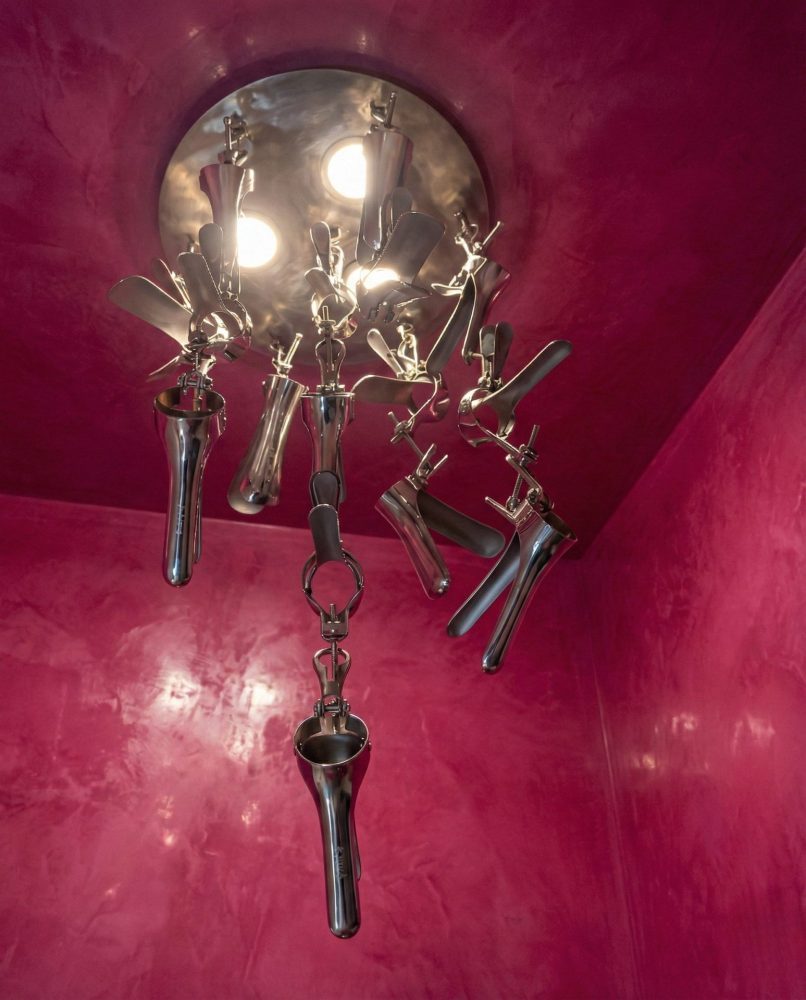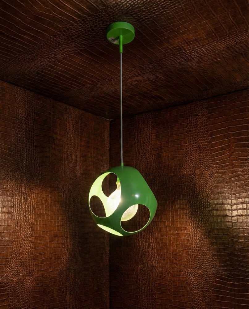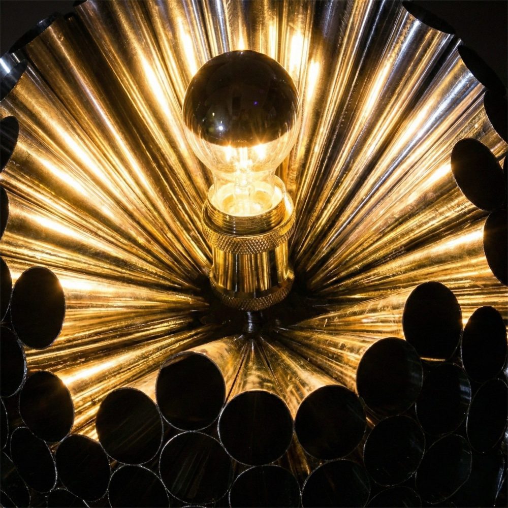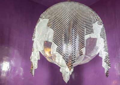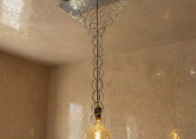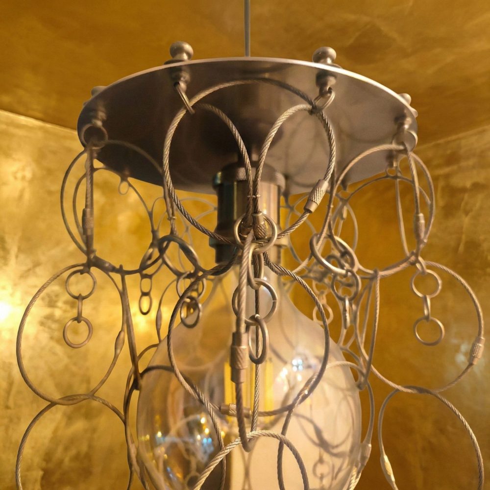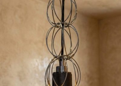 ELMO is a pendant lamp that combines vintage and modern art design. A chich work of contemporary charm and 60s references. Composed of steel rings, the artist was inspired by the armour of warriors, creating a protective crush similar to the one used under the helmets of warriors. Formed by a weave of rings that are opened and closed by hand, creating a ragged effect towards the bottom, small pointed studs are present at the top, adding even more character to the work.