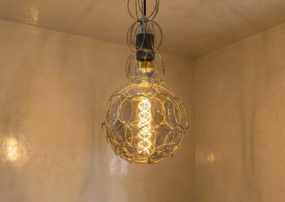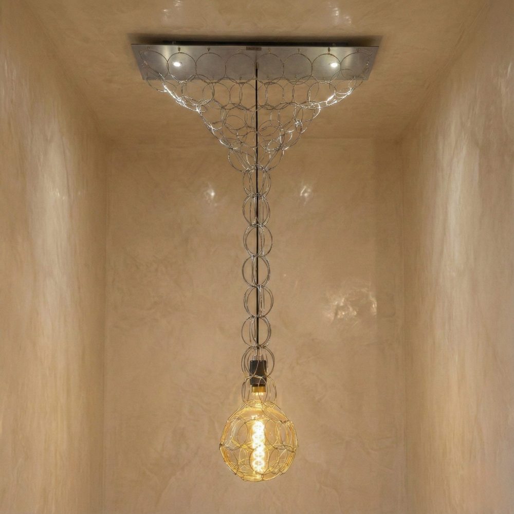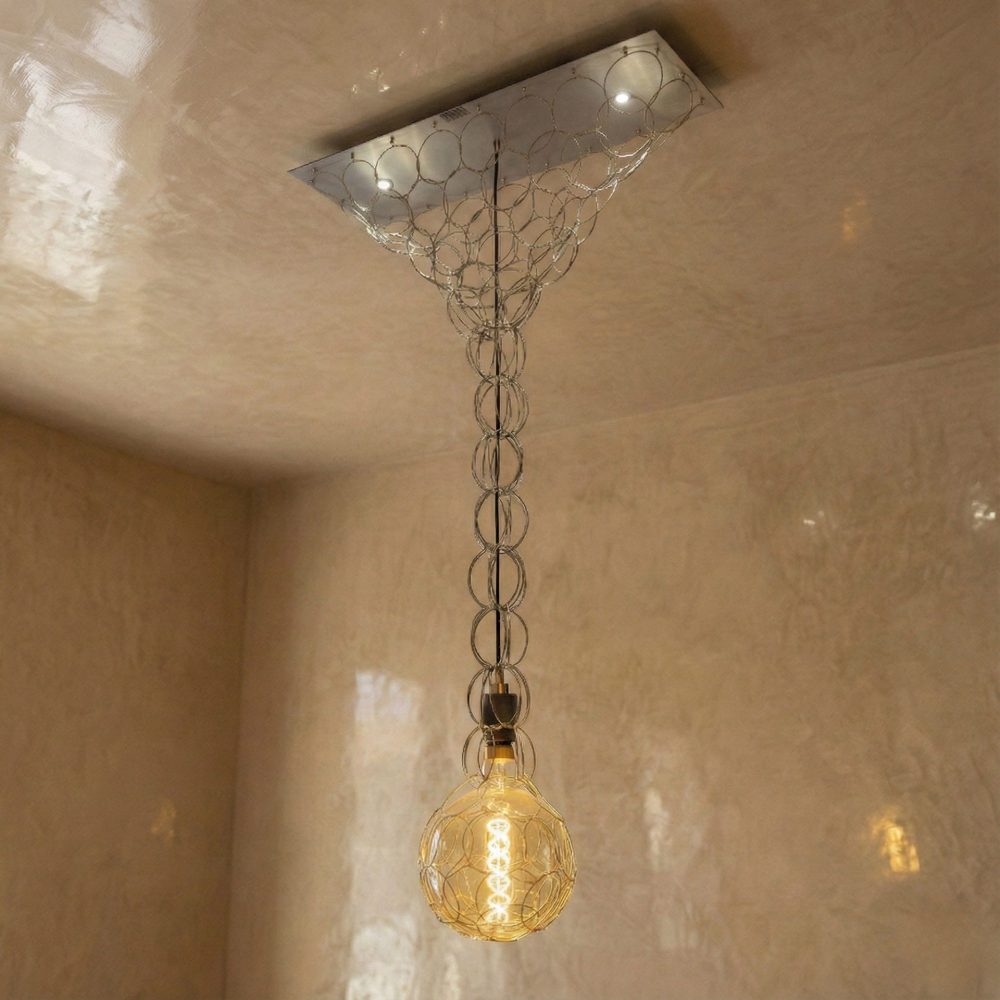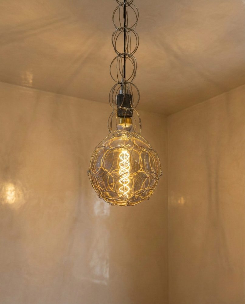 From a rectangular canopy begins a woven structure of flexible steel rings, intertwined around the electrical cord and culminating in an embrace around a large 6W LED bulb (20 cm diameter, 25 cm height).