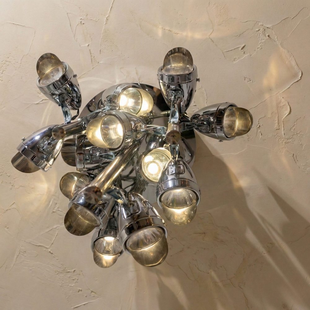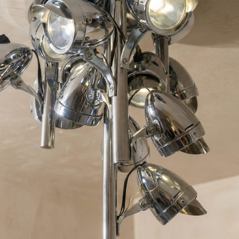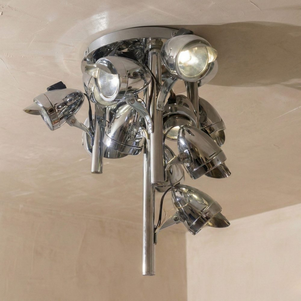 Luminary work of contemporary art. FAUSTO COPPI steel and metal chandelier, inspired by bicycle lights. It is placed in the ceiling as an original object of modern design. Outstanding lamp made of 13 adjustable lanterns, it effectively illuminates the surroundings. Lamp capable of diffusing a radiant light.