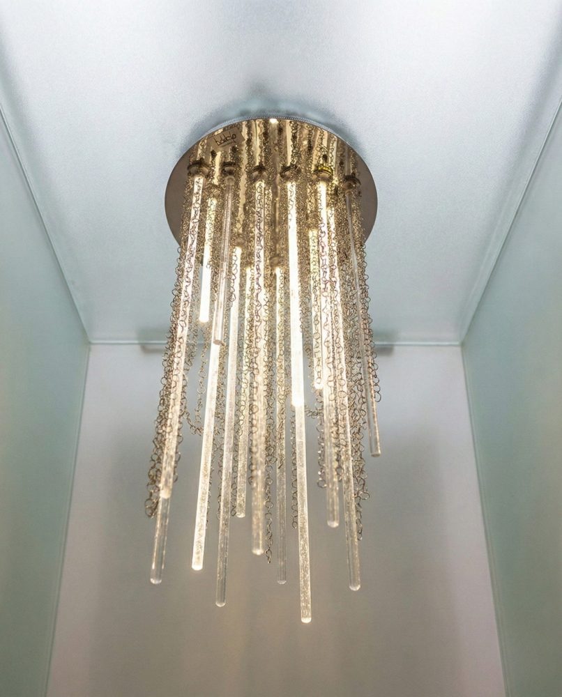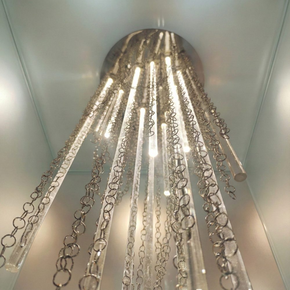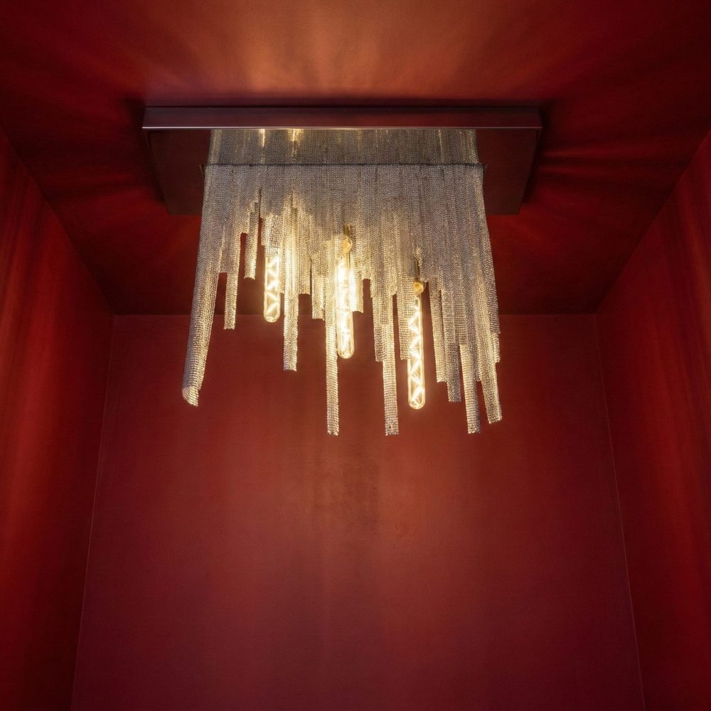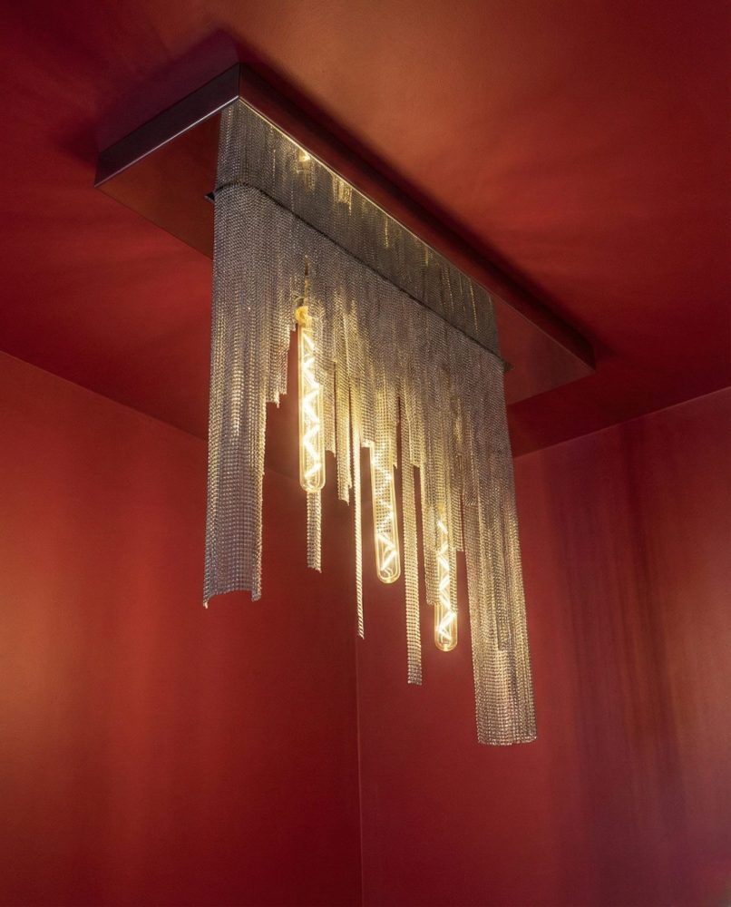Ceiling chandelier, consisting of elegant chains of discs that combine like wall jewellery to give an original and chic effect. The chains of steel discs decorate the wall like jewellery. BLADES is an object that gives a sense of movement, the pendants give a kinetic optical effect and the light reflected on the pendants diffuses soft lighting into the atmosphere.
