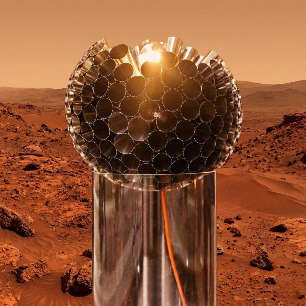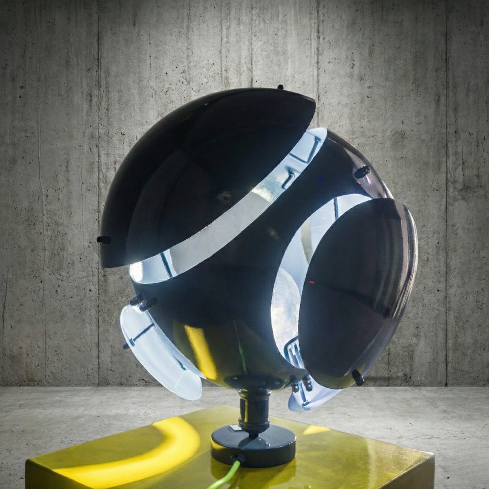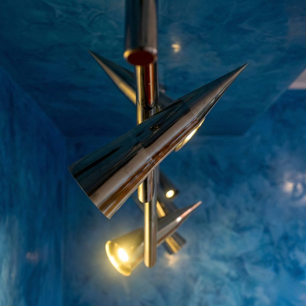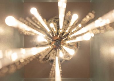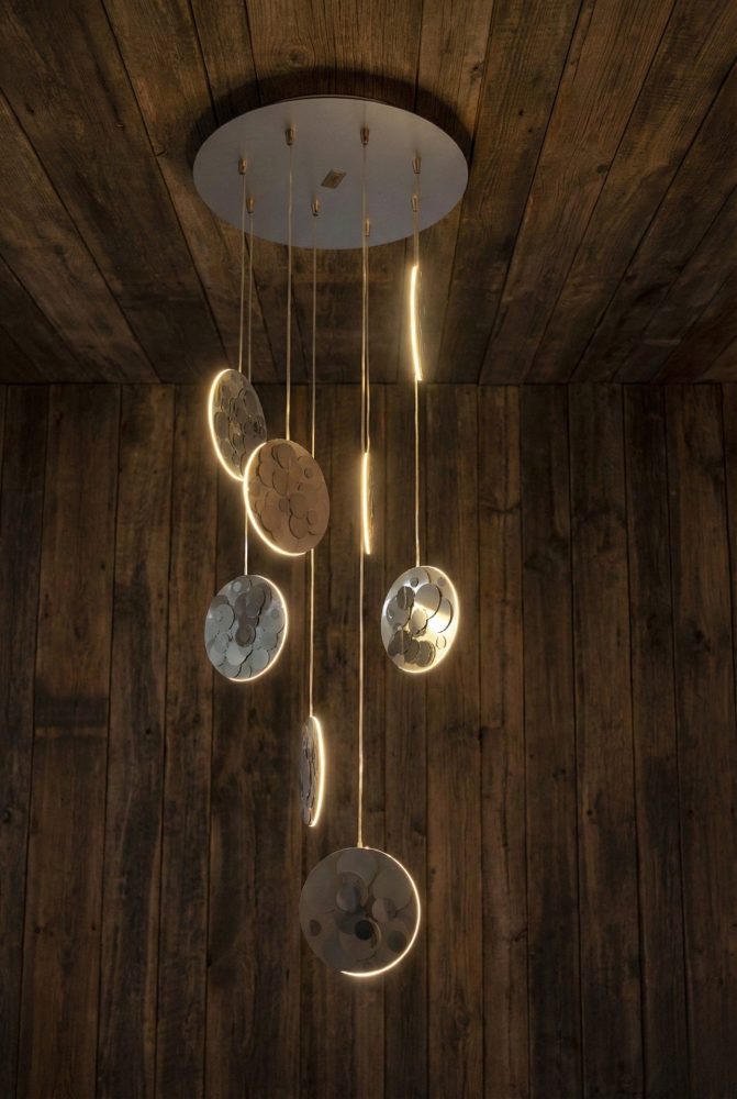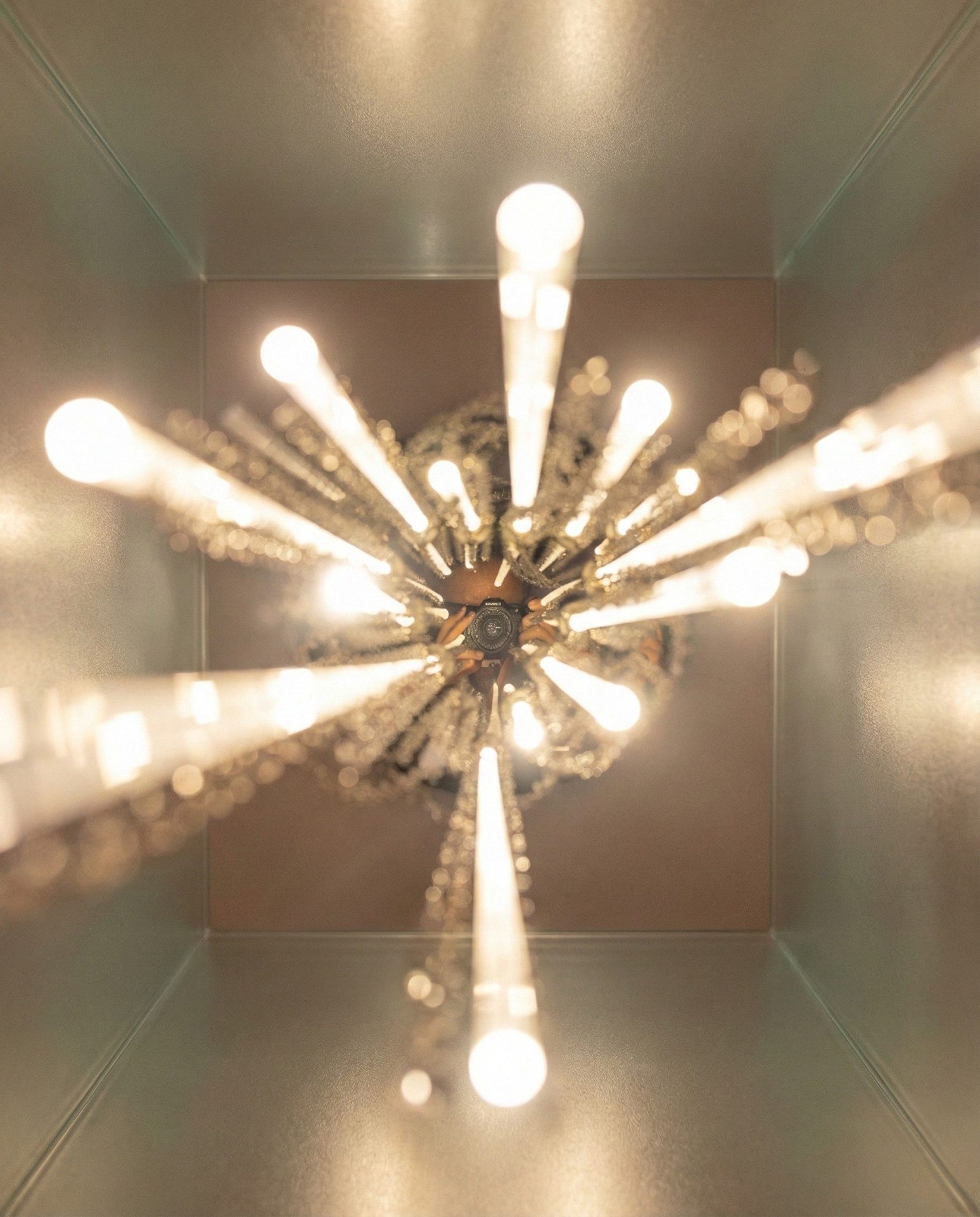 Poised between engineering and poetry, aluminum and plexiglass merge in a conceptual gesture that transforms the chandelier into a celestial machine: not just a source of illumination, but a manifestation of cosmic presence.