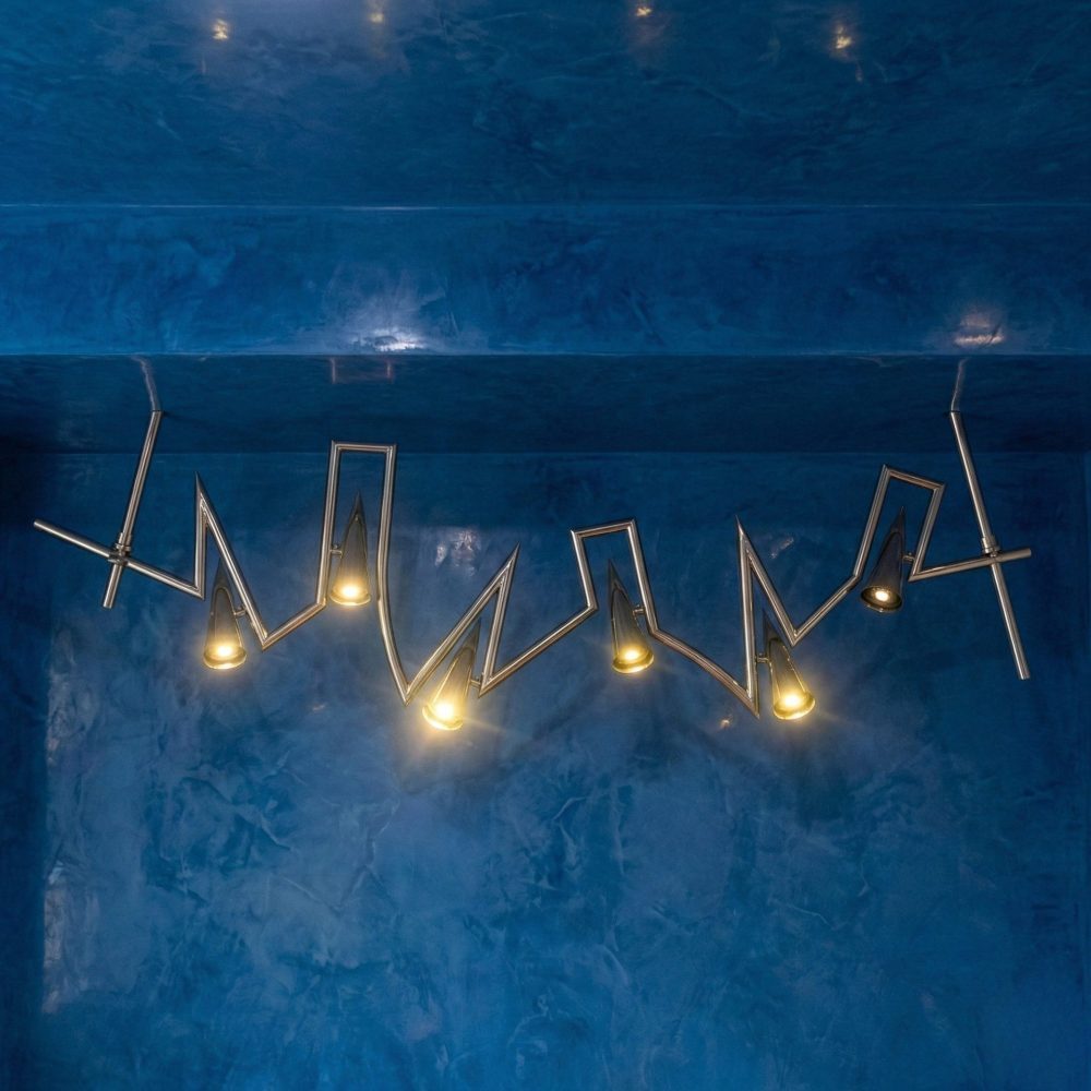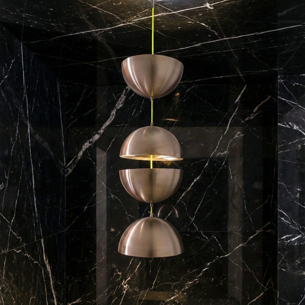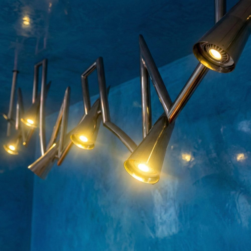Conceived as a tribute to lunar cycles, Eclissi is a suspended light sculpture composed of eight light points, where light, metal, and weightlessness converge in a symbolic and scenic balance.