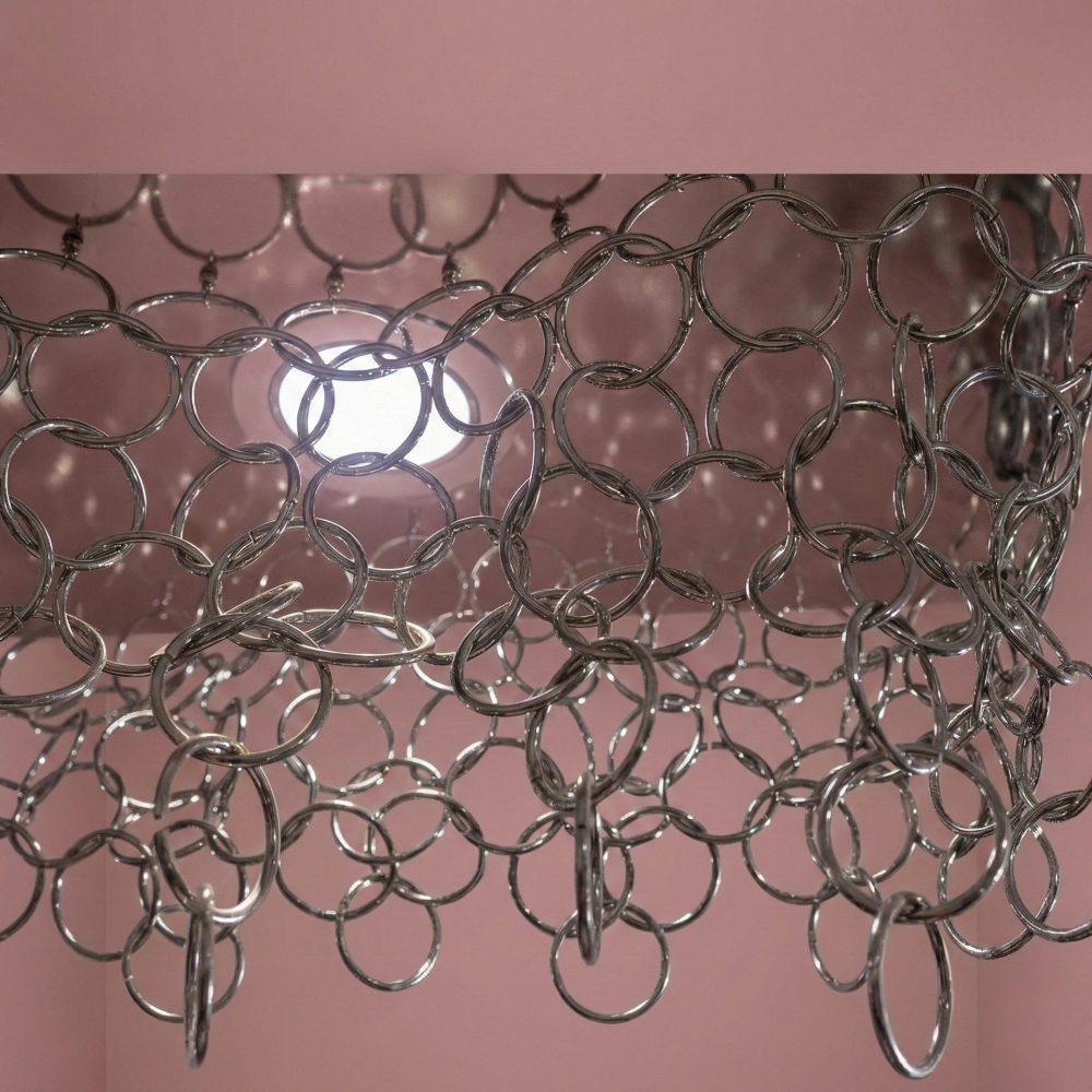 Iconic and minimalist ceiling chandelier. The intertwined steel rings lend an ethnic touch to the piece. WRAPED, with its chains of hanging rings, stylishly and soberly adorns rooms with modern and vintage décor.