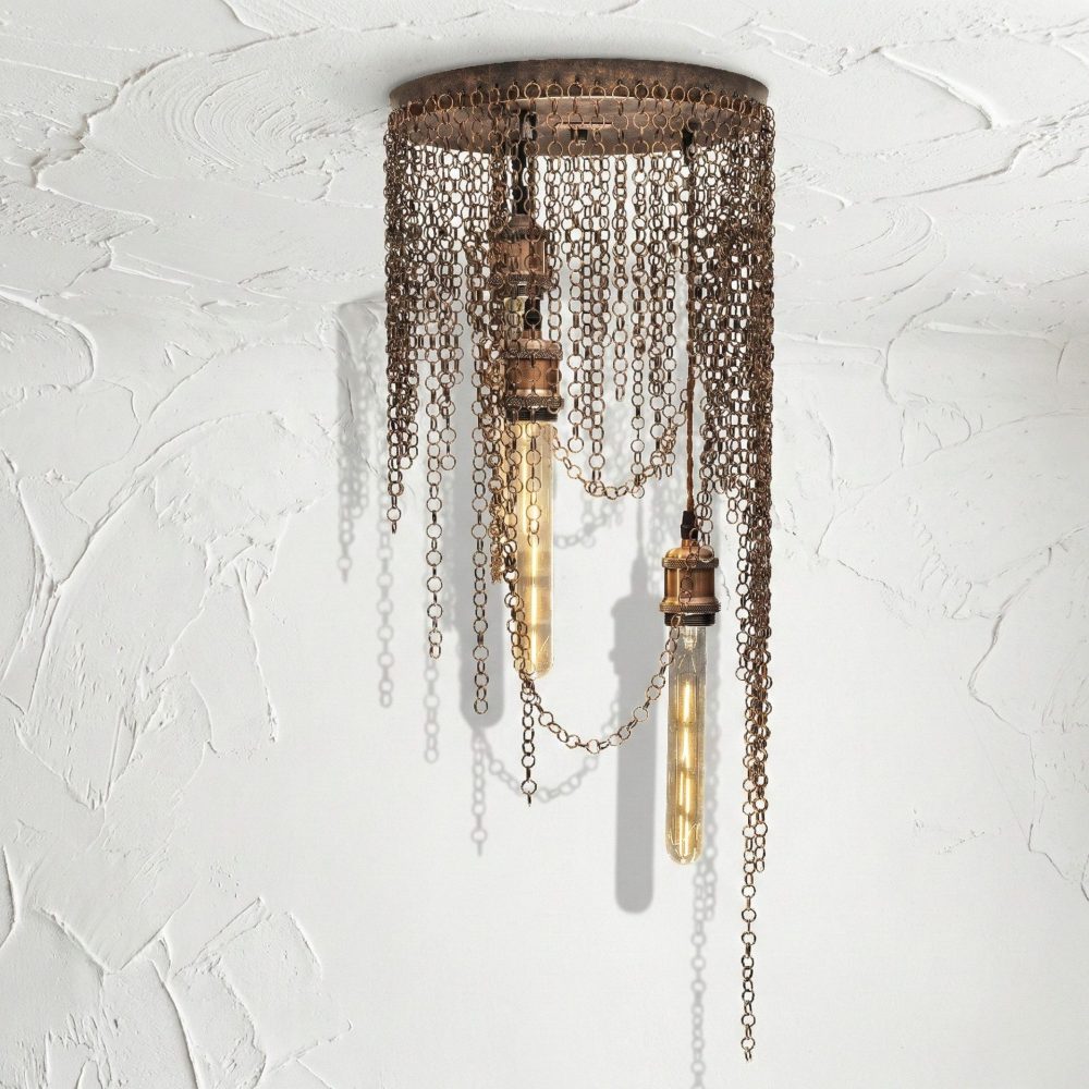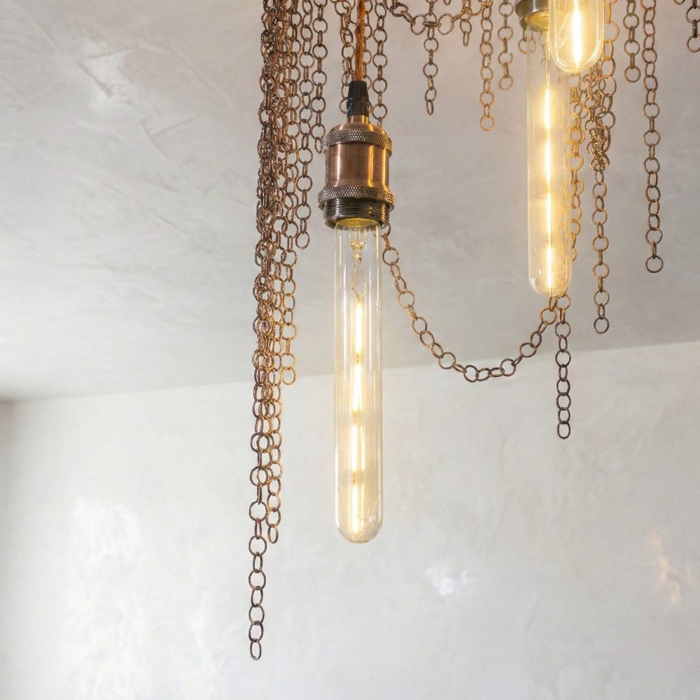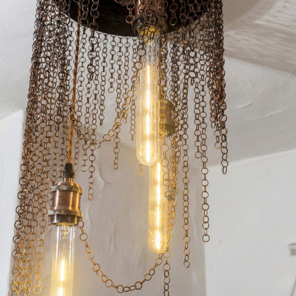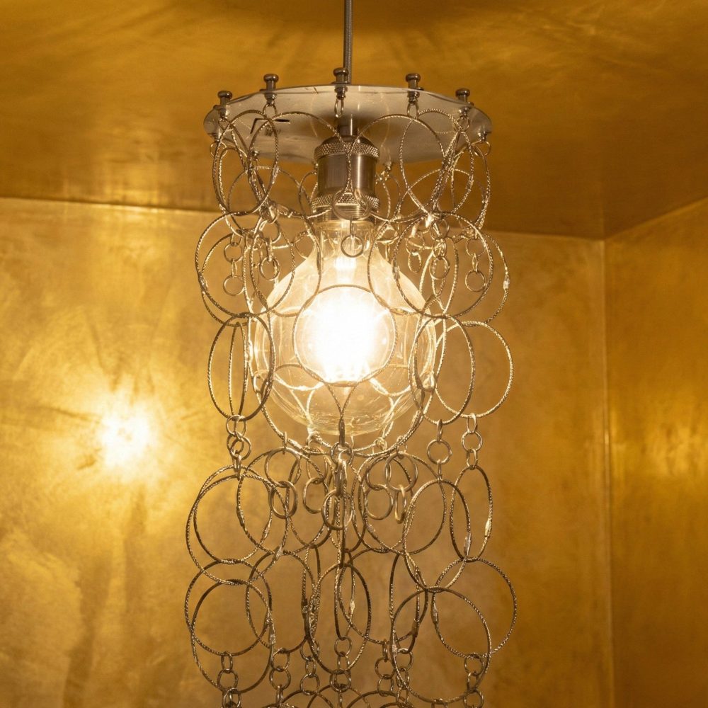 A modern, classy chandelier with a vaguely retro flavour. The base consists of a rosette and three ropes from which LED bulbs are hung. The chains of rings installed along the diameter, sway and fluctuate, giving a harmonious and animated effect. Ideal placed in any environment, recommended indoors.
