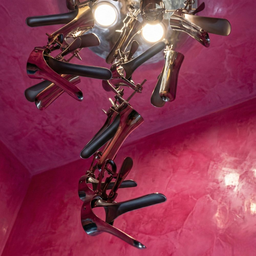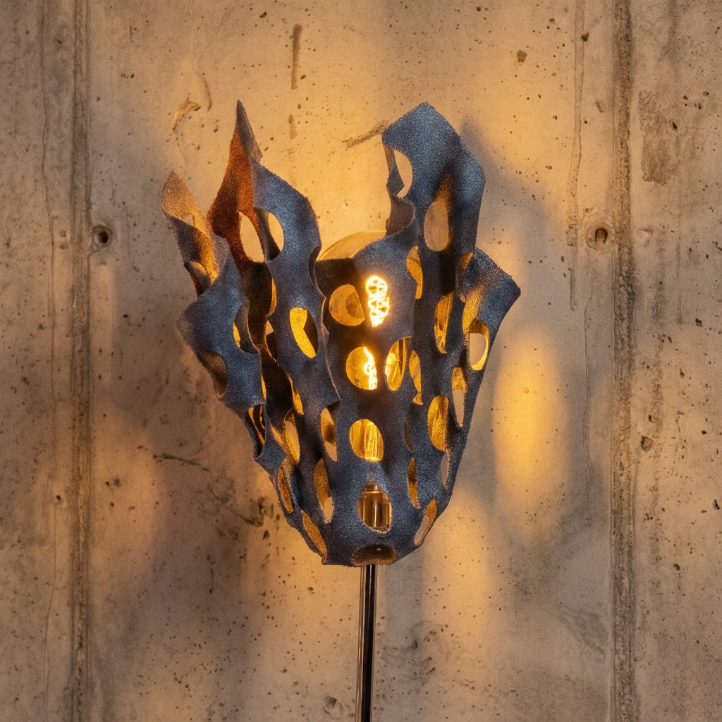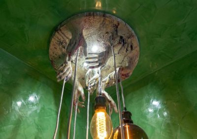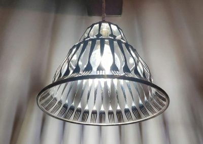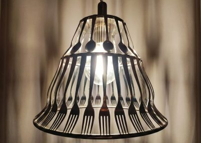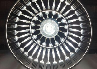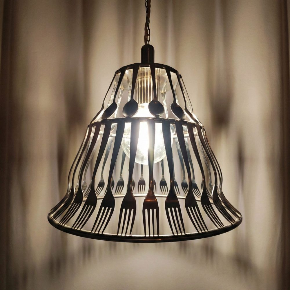 A work of industrial design that transforms the ordinary into the extraordinary.The chandelier is shaped like a bell a metallic architecture born from the poetic recycling of common cutlery. The radial arrangement of forks and spoons creates a hypnotic visual rhythm. The tines of the forks, pointing downwards, act as a metallic fringe, lending the object an almost Gothic elegance, yet reinterpreted with a modern flair.The polished surfaces of the cutlery act as curved mirrors, capturing and fragmenting the light from the central bulb. This creates a play of light and shadow (chiaroscuro) that projects geometric patterns onto the surrounding walls, turning the room into a dynamic art gallery.Objects originally designed for a practical function (dining) are decontextualized to take on an aesthetic and luminous purpose. It is a tribute to the conviviality of the table, elevated to a source of light.”An object that not only illuminates the room but invites us to reflect on the beauty hidden within the utensils we use every day.”