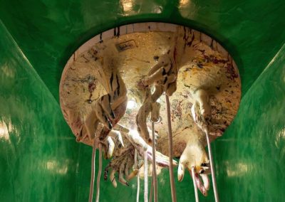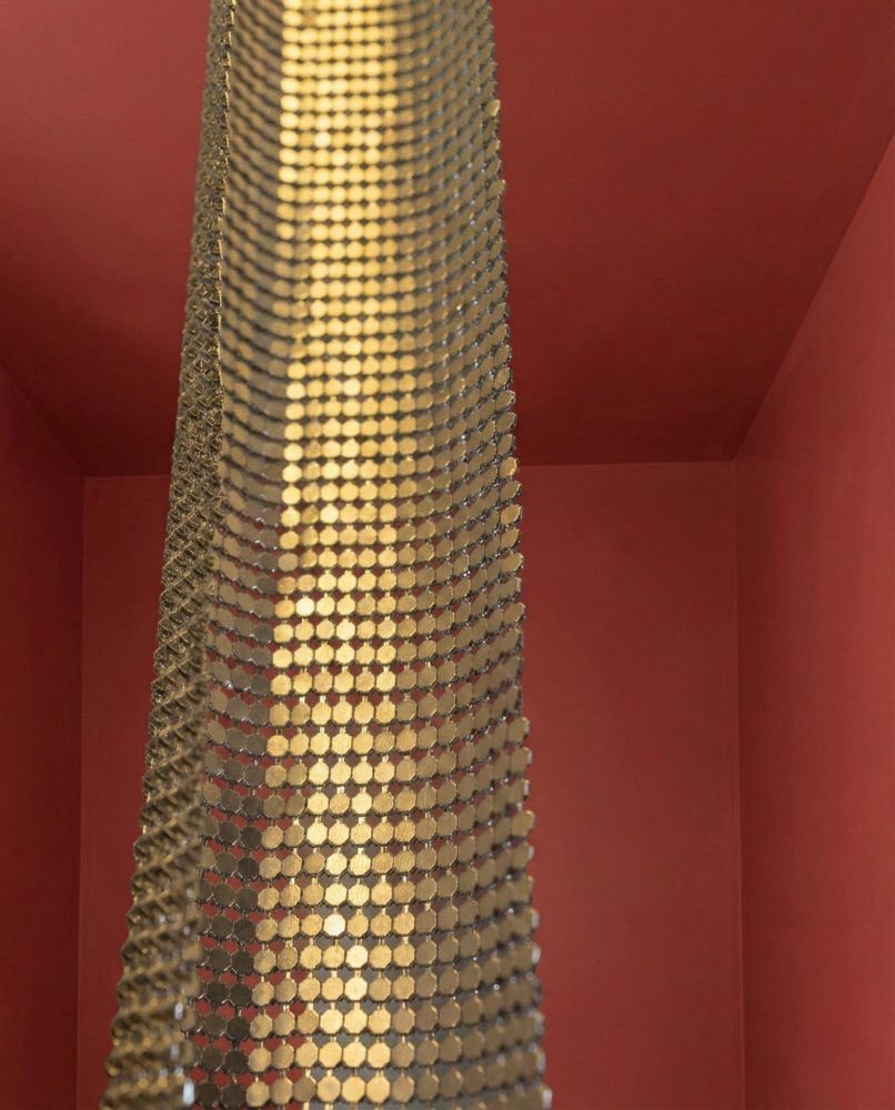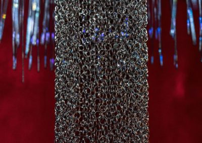 Beside the tubes, parallel chains made of thousands of steel rings descend in rows of four, creating a visual contrast between the light transparency of plexiglass and the dense metallic texture of steel.