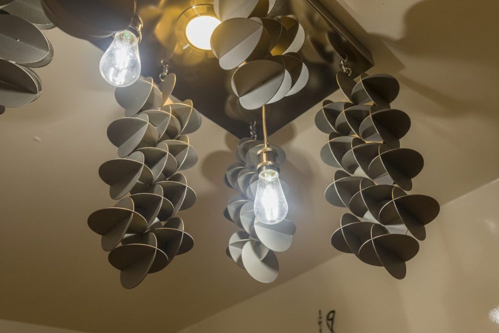 INSPIRATION: The blades of an electric razor looked at under the microscope. I built this chandelier straight away. Without drawing it, I did some joining and folding tests with cardboard discs. I handed the tests over to the
