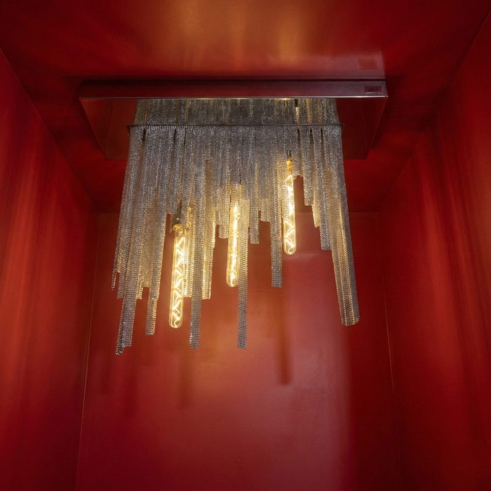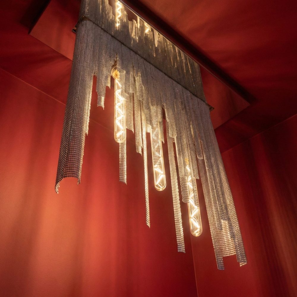 Suspension chandelier with a modern vintage style gives a sense of elegance and refinement to the room. A work composed of a rectangular structure on which are installed hand-sewn metal mesh fringes and three light bulbs that highlight the brilliance and shapes created with woven steel. Majestic or and harmonious appearance, ideal for both domestic and public environments.