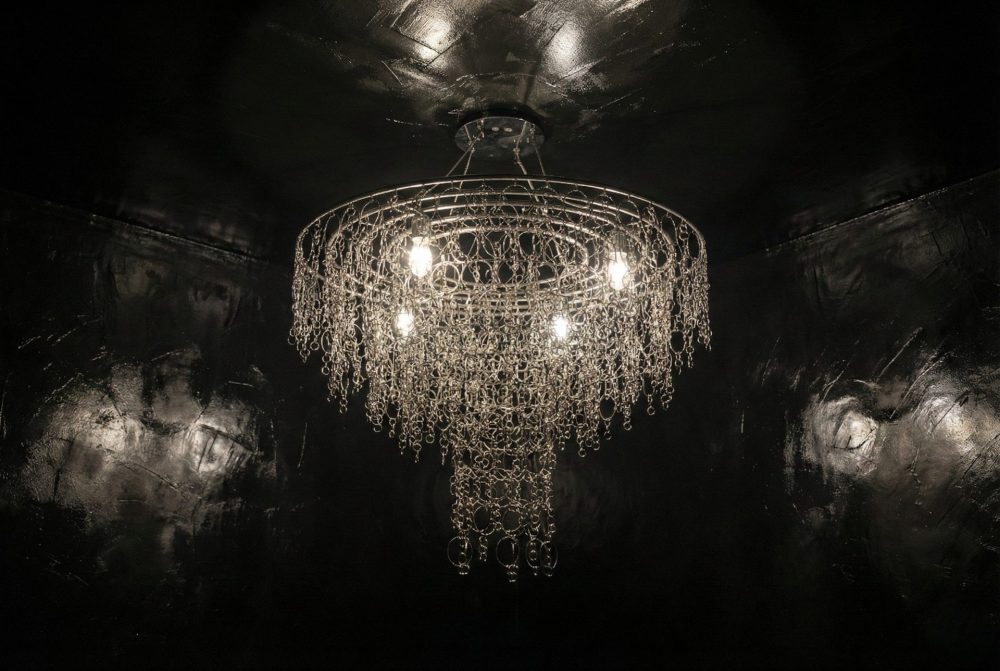 SHARP is a chandelier that expresses strong personality. The careful interlocking of the clips is weighted to distribute the weights evenly along the chain, preserving the link. The disc towers together with the LEDs and pendant lamps create an image of light and reflection in the wall and surroundings. Outlining an eccentric and classic atmosphere.