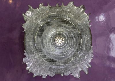ROSE ROSE DIAMETER 30 CM, SATIN STEEL FINISH WITH TWO RECESSED LED SPOTLIGHTS 3.5W EACH / LAMPSHADE CREATED WITH 4 WOOL PANELS 40X40 CM. FIRST DRILLED WITH A DIE, MIXED IN PAINT AND PUT TO DRY ON A SPHERE TO TAKE SHAPE, FINALLY MULTICOLORED PAINTING WITH CERAMIC EFFECT /