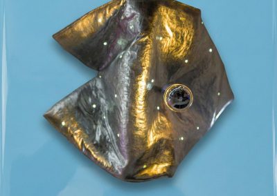 Object: Spherical suspended sculpture in steel, freehand cut, with a silicone gel breast prosthesis adhered and stuccoed onto the sphere.