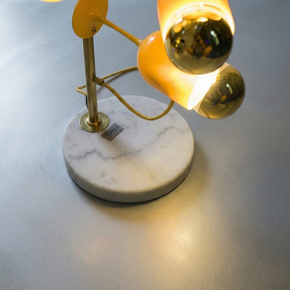 L’illuminazione è completata da quattro lampadine speciali a forma ovale, che aggiungono un tocco scultoreo e contemporaneo all’insieme.