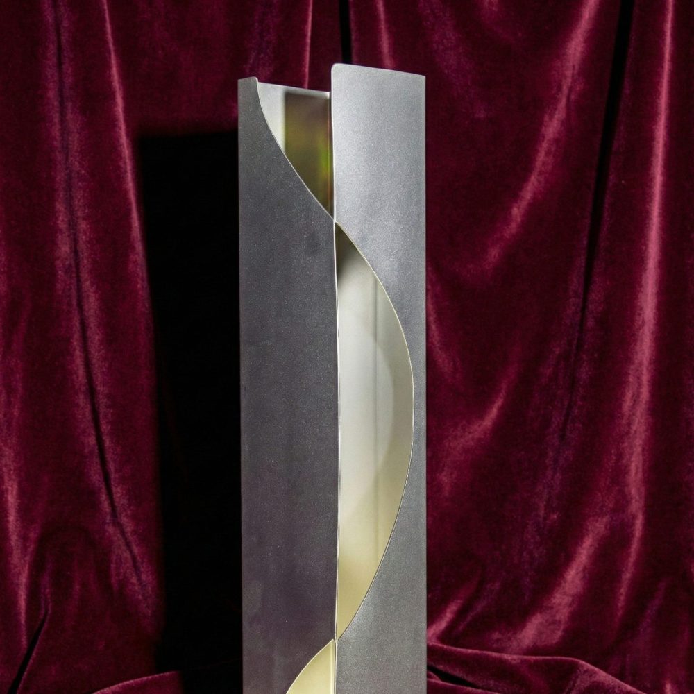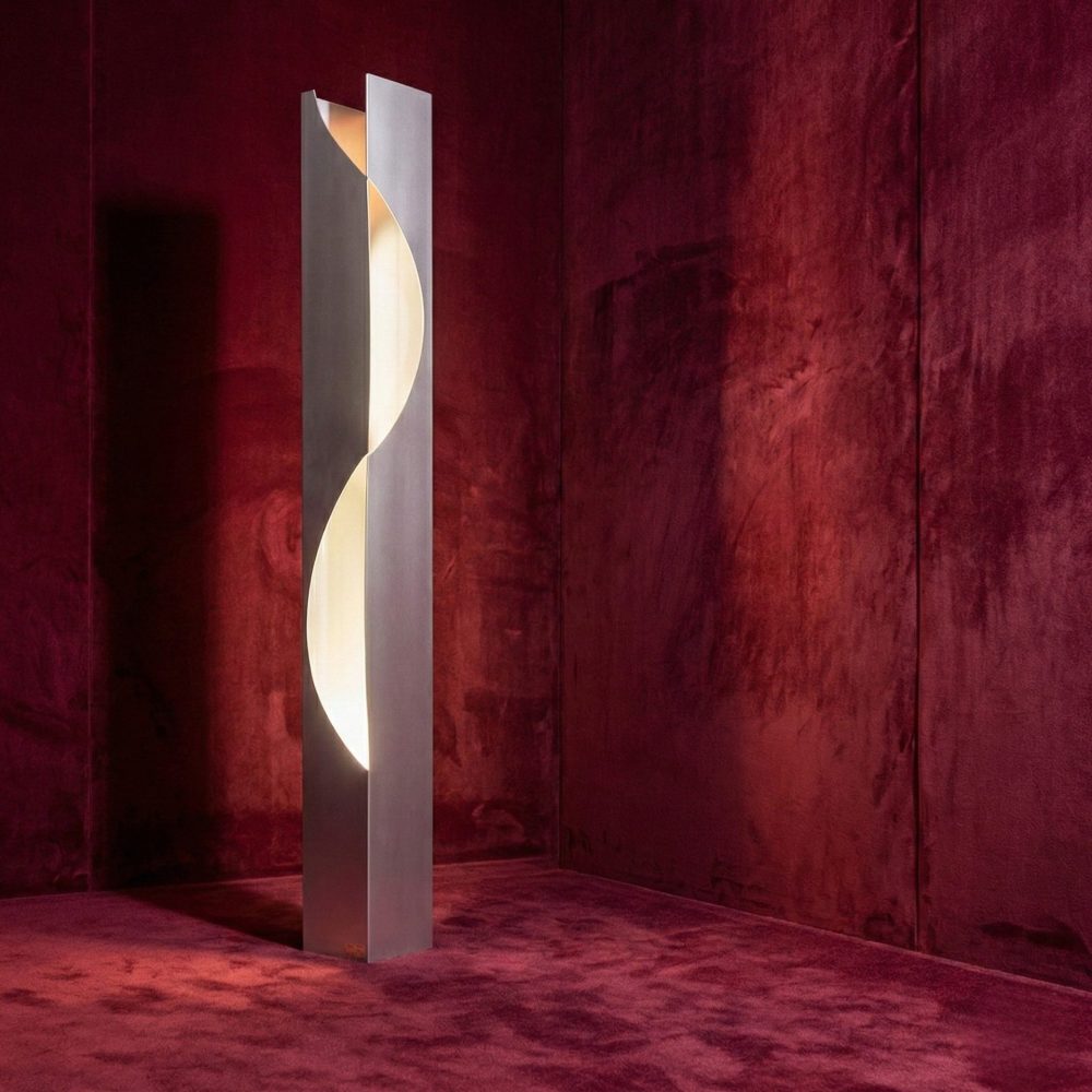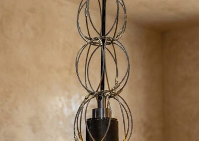 L’acciaio, solitamente rigido e industriale, viene qui addomesticato in una trama organica e fluida, capace di evocare l’idea del bozzolo, della crescita silenziosa, dell’attesa che precede la rivelazione.
