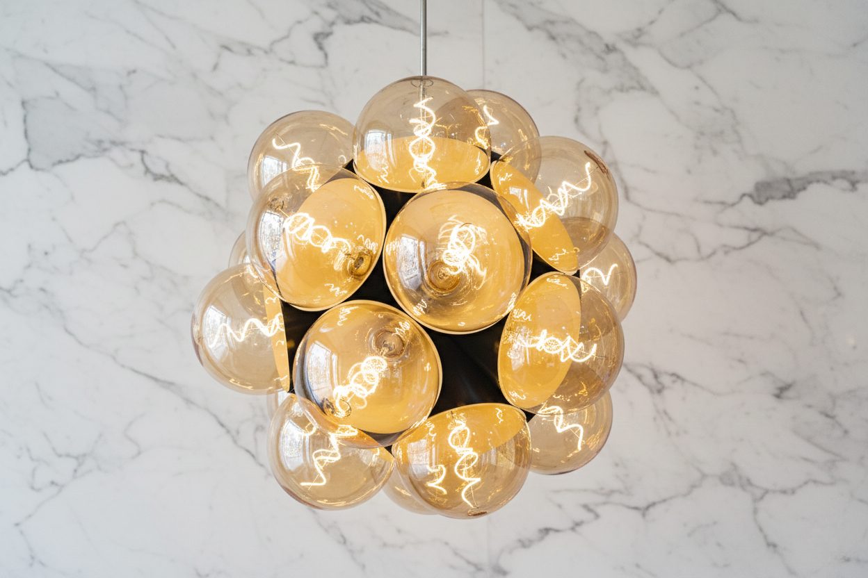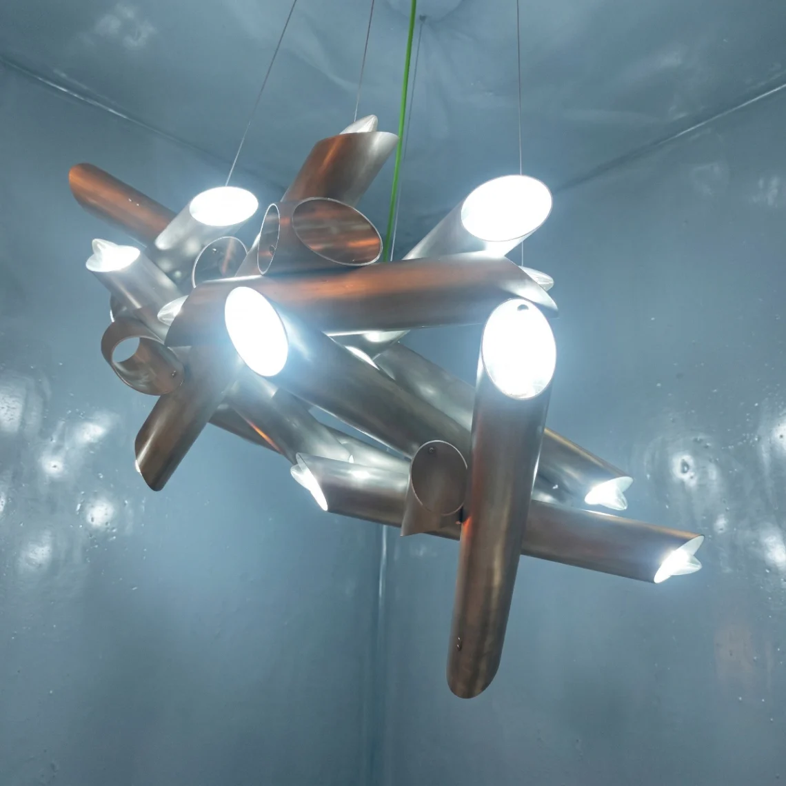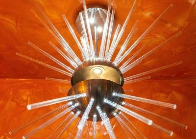 Dal corpo di ciascuna semisfera emergono 43 tubi in plexiglass di differenti lunghezze, come raggi di luce solidificati. Al loro interno, piccole sfere LED da 1W retroilluminano i tubi, generando un alone vibrante e sospeso, simile a un’esplosione controllata di energia luminosa.