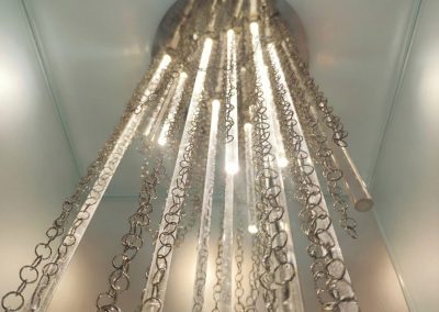 Dal rosone metallico si sviluppa una geometria luminosa composta da tubi in plexiglass retroilluminati, disposti a triangolo: questi elementi verticali catturano e rifrangono la luce, come colonne di ghiaccio sospese. Accanto ai tubi, scendono in parallelo catene formate da migliaia di anelli in acciaio, organizzate in file da quattro, creando un contrasto visivo tra la trasparenza leggera del plexiglass e la densità metallica del ferro.
