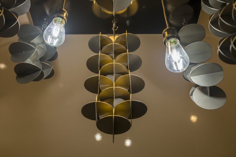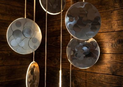 metallica cucita a mano e tre lampadine che ne risaltano la brillantezza e le forme create con l’acciaio
