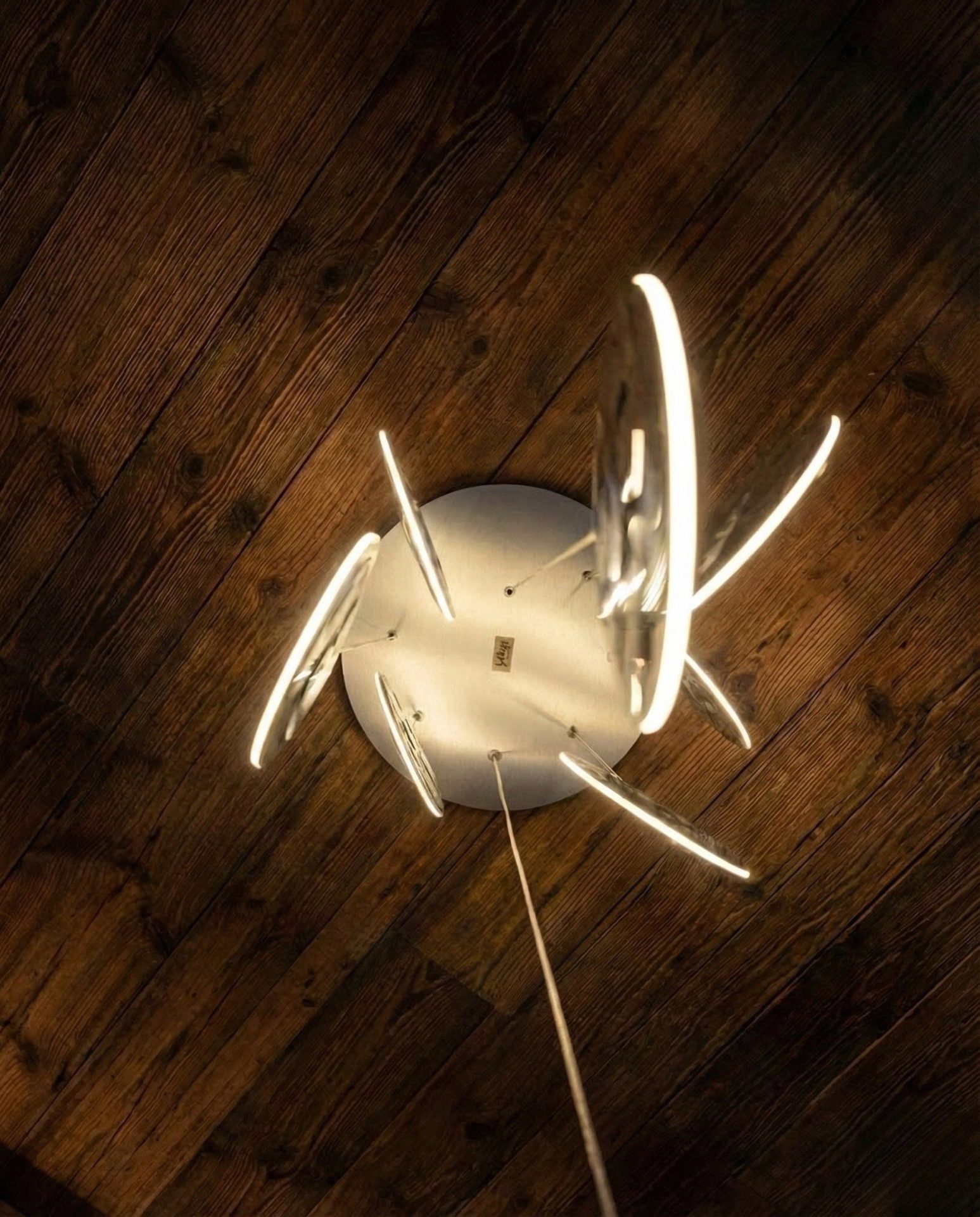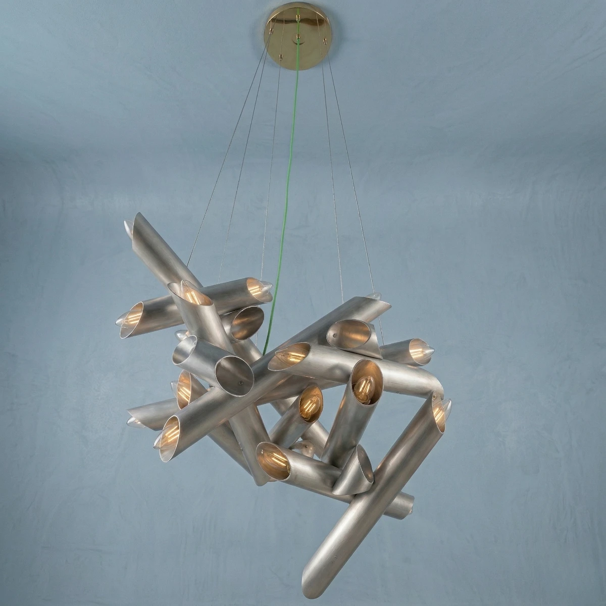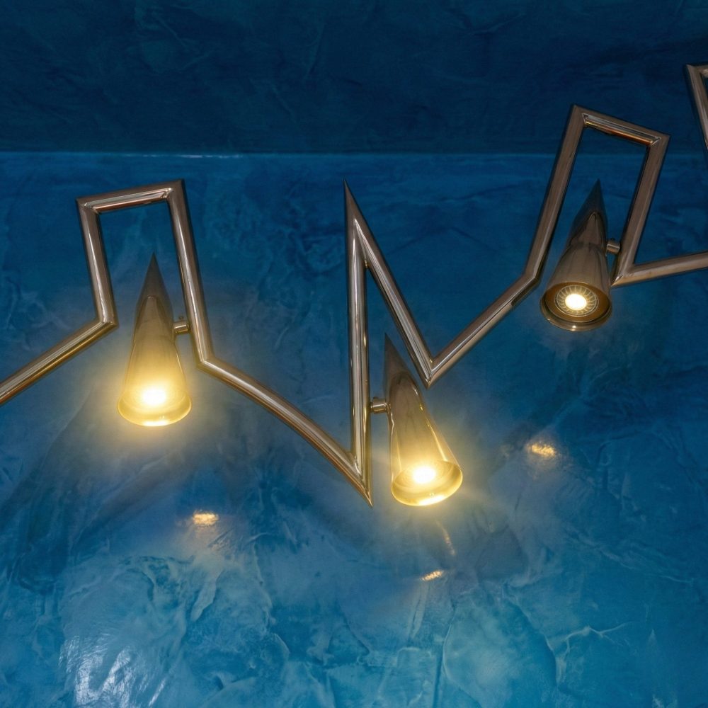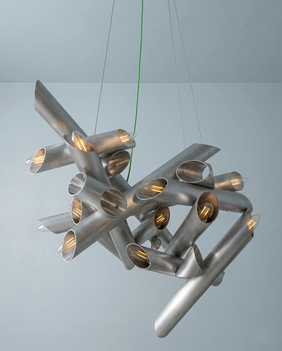 In bilico tra ingegneria e poesia, l’alluminio e il plexiglass si fondono in un gesto concettuale che trasforma il lampadario in una macchina celeste: non solo fonte di illuminazione, ma manifestazione di una presenza cosmica.