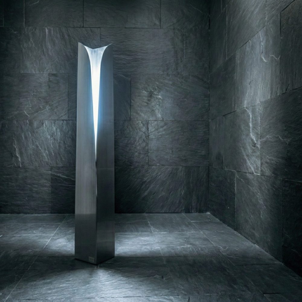 Fontana Fredda è una scultura luminosa a sospensione che reinterpreta la monumentalità di una fontana ghiacciata, trasportandone l’essenza in una composizione eterea e verticale. L’opera è ispirata all’immagine poetica di una fontana immobilizzata dal gelo sul Lago di Misurina, e restituisce quella visione attraverso materiali freddi, luce diffusa e struttura ritmica.