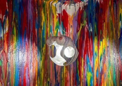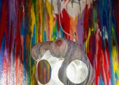 La cura è una scultura luminosa a sospensione che unisce materia, gesto artistico e impegno sociale in un’opera potente e simbolica. Il corpo centrale è una sfera in acciaio, tagliata a mano libera, successivamente lavorata con una verniciatura multicolore effetto ceramico all’esterno e una lucidatura a specchio all’interno, che ne esalta profondità e riflessi.