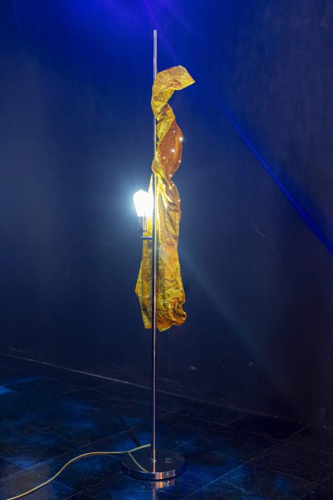 oggetto: SCULTURA LUMINOSA / PIANTANA CON BASE E TUBO IN FERRO CROMATO , IN APPOGGIO E PLASMABILE A PIACERE PANNELLO DI VELLUTO DOPPIO GIALLO OCRA , ACCOPPIATO INTERNAMENTE CON CARTA STAGNOLA / IMPIANTO 50 SFERE LED INTERNO , PANNELLO FISSATO AL TUBO TRAMITE 5 CALAMITE NASCOSTE , DANNO LA POSSIBILITA’ DI REGOLARE L’ARRICCIATURA