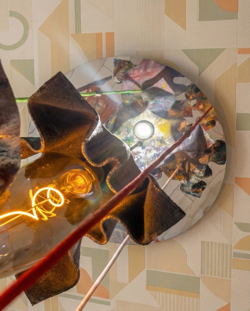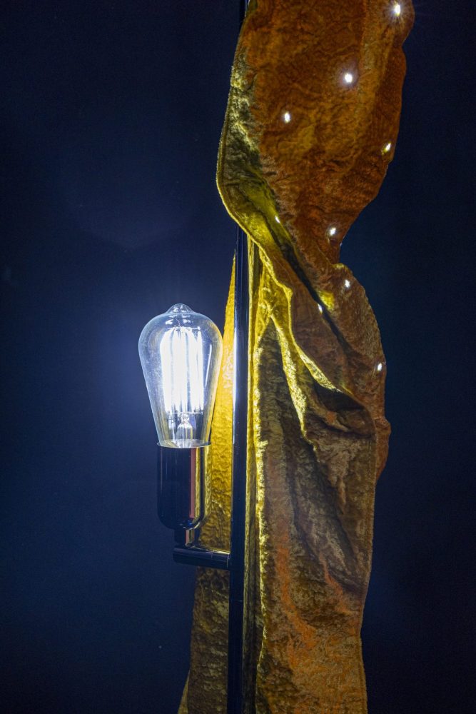 Elemento centrale dell’opera è il paralume scultoreo, realizzato con quattro pannelli di lana. Ogni pannello è stato forato a mano con fustella, quindi impastato nella vernice e modellato su una sfera per acquisire una forma curva e organica. Il trattamento finale è una verniciatura multicolore che simula la brillantezza e le texture della ceramica smaltata, ottenendo un effetto visivo inaspettato e raffinato.