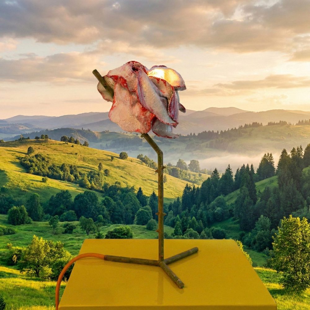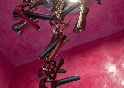 L’opera è sospesa mediante cavo in acciaio, in un equilibrio visivo tra corpo e luce, tra esposizione e protezione. L’intervento pop è evidente nella scelta dei materiali industriali e nel gesto diretto e riconoscibile, ma si carica di significato grazie all’omaggio all’associazione Doppia Elica, attiva nella prevenzione e ricerca sui tumori al seno.