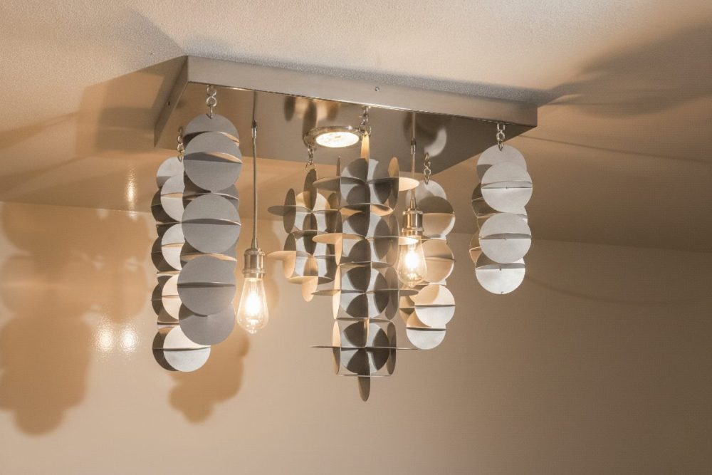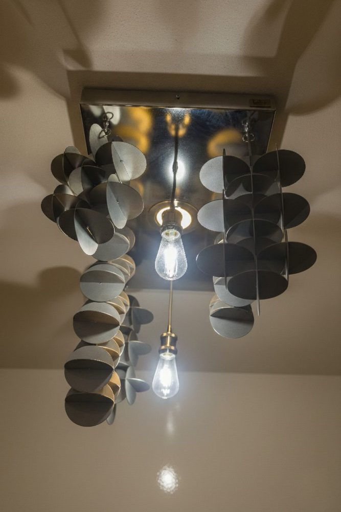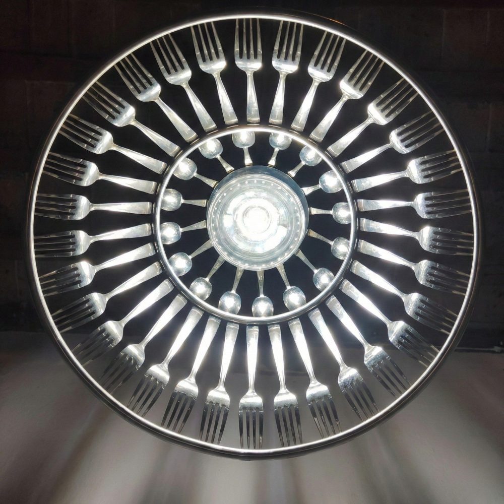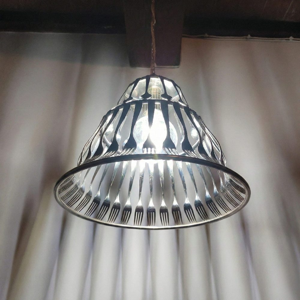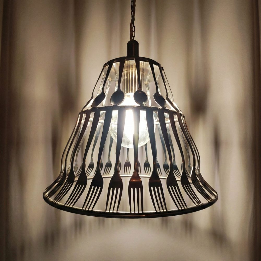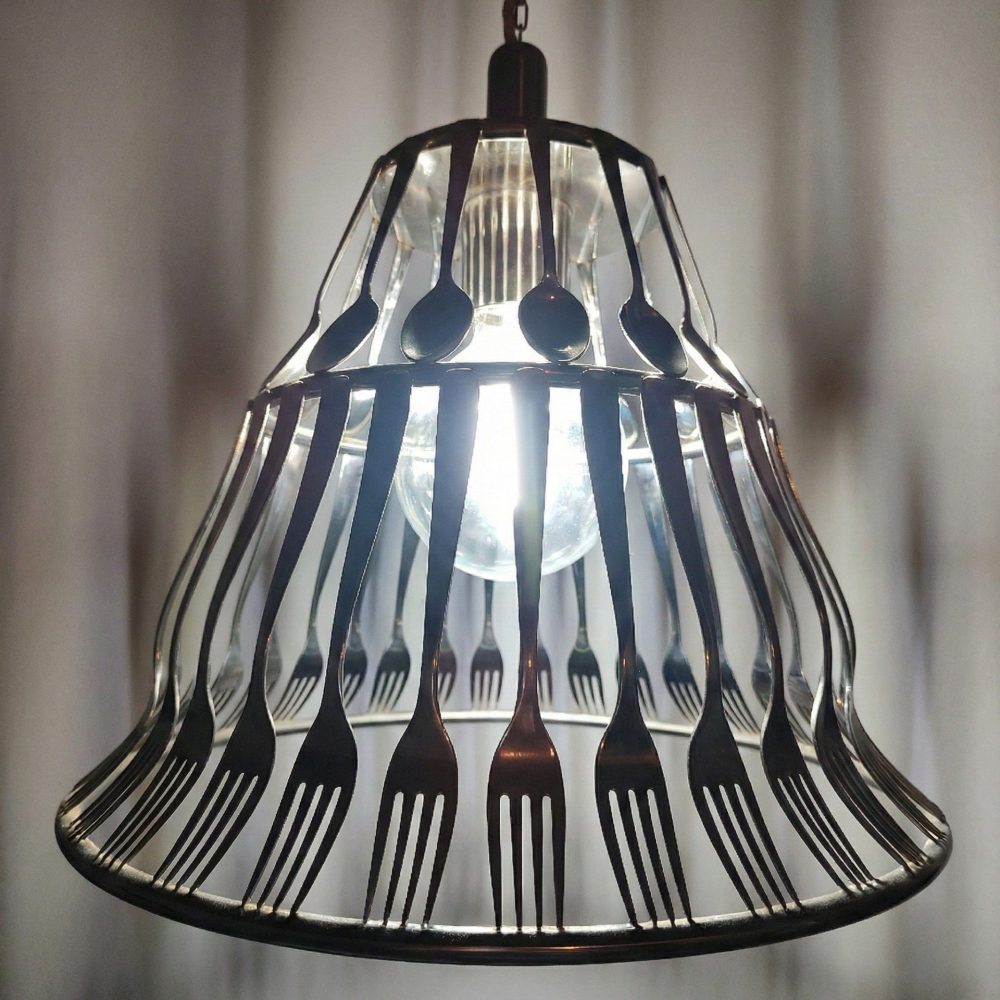 La disposizione radiale di forchette e cucchiai crea un ritmo visivo ipnotico. Le punte delle forchette, rivolte verso il basso, fungono da frangia metallica, conferendo all’oggetto un’eleganza quasi gotica ma reinterpretata in chiave moderna.Le superfici lucide delle posate agiscono come specchi curvi, catturando e frammentando la luce della lampadina centrale. Questo crea un gioco di chiaroscuri che proietta ombre geometriche sulle pareti circostanti, trasformando l’ambiente in una galleria d’arte dinamica. Oggetti nati per una funzione pratica (mangiare) vengono decontestualizzati per assumere una funzione estetica e luminosa. È un omaggio alla convivialità della tavola che si eleva a sorgente di luce.