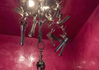 Fissata con collante e stucco alla superficie, è applicata una protesi mammaria in gel siliconico, elemento centrale dell’opera, che ne definisce sia la valenza estetica che simbolica. Un portalampada inclinato al suo interno ospita una lampadina LED da 10W a luce fredda, mentre un faretto incassato sul rosone superiore ne illumina il profilo dall’alto, accentuando le curve, i pieni e i vuoti della forma.