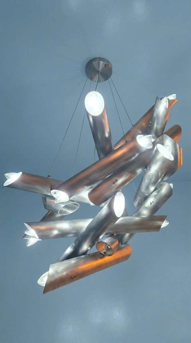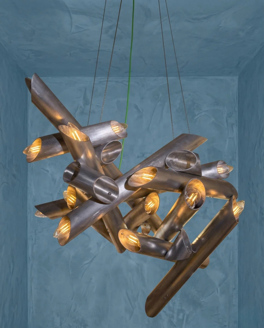 Opera di industrial design che trasforma l’ordinario in straordinario.Il lampadario si presenta come una struttura a campana, un’architettura metallica nata dal riciclo poetico di posate comuni.