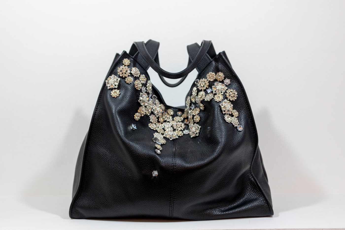 • Motivo davanti tempestato da fiori metallo e strass di varie tipologie diverse incastonati a mano sulla pelle